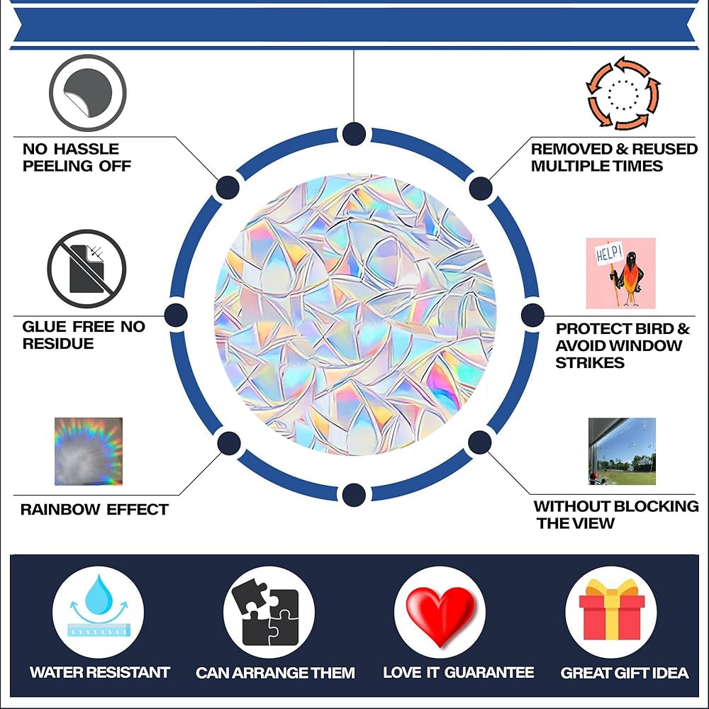 When applied to windows hit by direct sunlight, these prisms make vivid rainbows that shift and stretch far into your house on a bright day. In darker windows, they appear as beautiful orbs that may save birds.