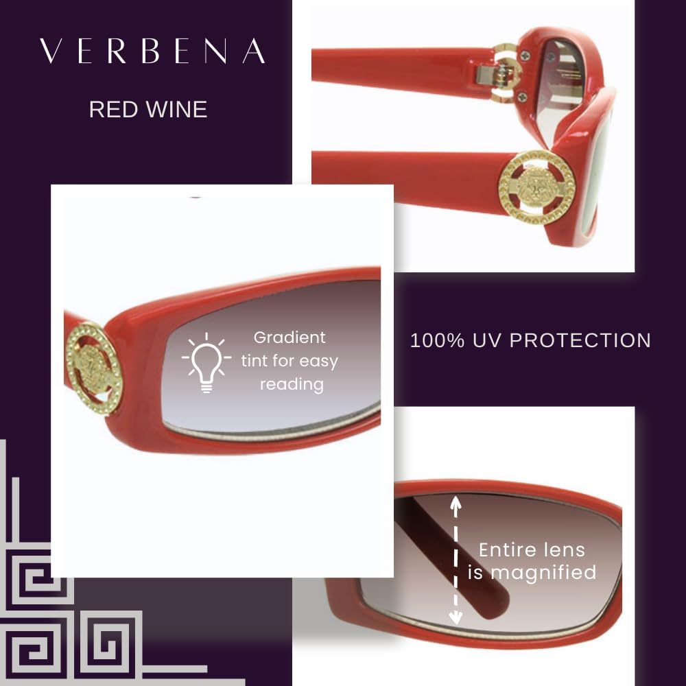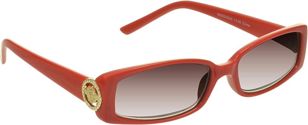 Put on the Ritz with these gorgeous full lens sun readers. Beautiful rectangle shaped dark tinted reading glasses will be one of your favorite accessories. You can wear these sunglasses by the pool, at the beach, driving, playing golf or just relaxing at the park. Sophisticated gold lion emblem resembles the famous "V" designer. Reading glasses don't have to be drab and plain. They should be a genuine fashion accessory. These cheater glasses come in 4 beautiful colors: