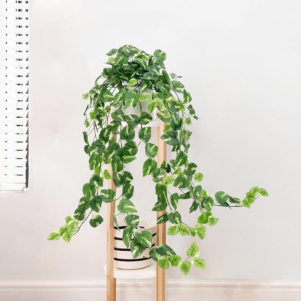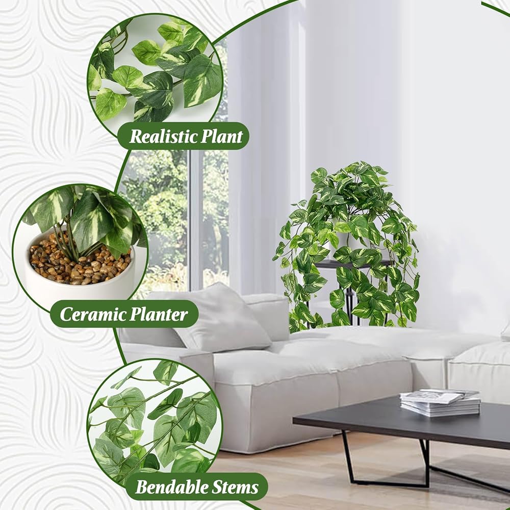Fake Plants Indoor, Artifical Potted Trailing Ivy Faux Pothos Plant for Home Decor Fake Greenery with White Ceramic Planter for Bedroom Living Room Office Garden Table Shelf Decor(Dark Green)