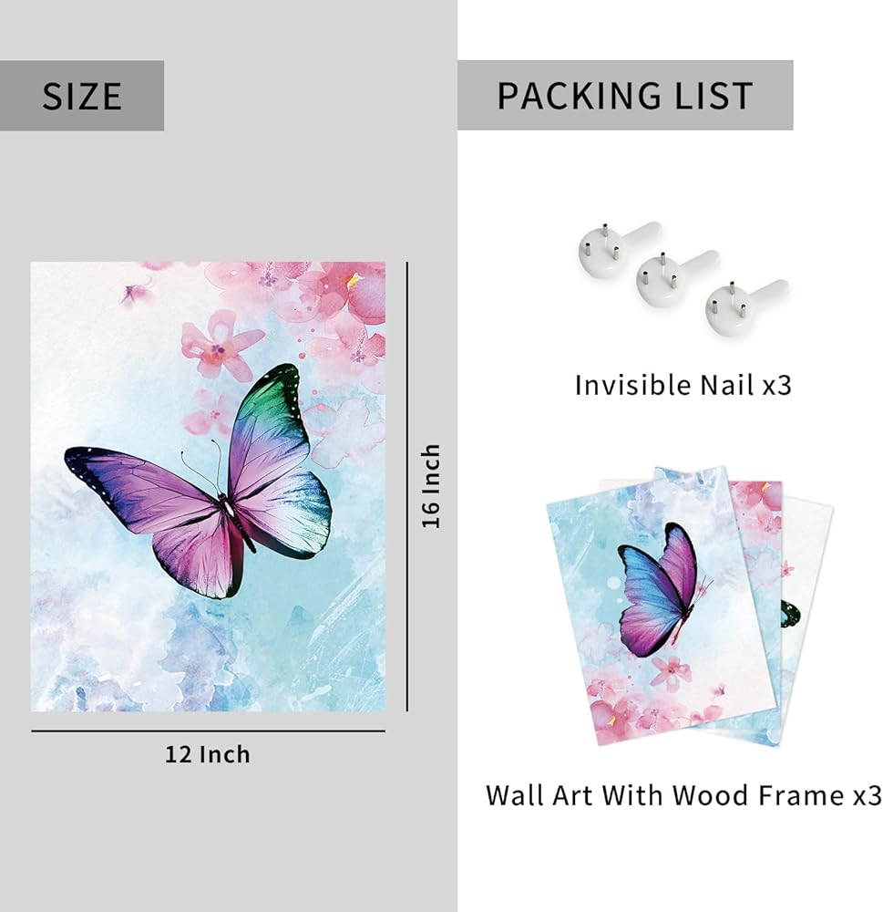 MZYHOME Butterfly Canvas Wall Art Decor 3 Piece Fantasy Girls Wall Art Watercolor Art Print Butterflies for Wall Art Living Room Bedroom Canvas With Wood Framed 12x16 Inch