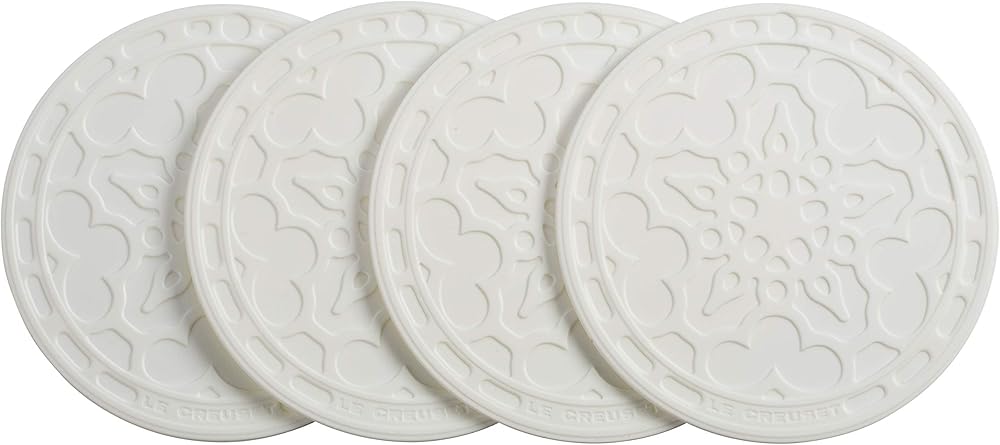 Available in a full range of colors to complement any room's design scheme, this set of four Silicone French coasters protects delicate surfaces from hot and cold beverages and condensation. The coasters, which measure 4 by 4 by 1 inches, feature stain-resistant, non-abrasive Silicone construction, and they resist heat up to 482 degrees F (250 degrees C). Inspired by the architectural cast- and wrought-iron structures and buildings of the Belle Epoque (French for "beautiful era"), the intricate design on each Silicone French coaster allows these useful accessories to fit in among most any room decor, from modern and sophisticated to traditional and elegant. And like all Le Creuset Silicone, the French coasters clean easily with a simple cycle through the dishwasher.