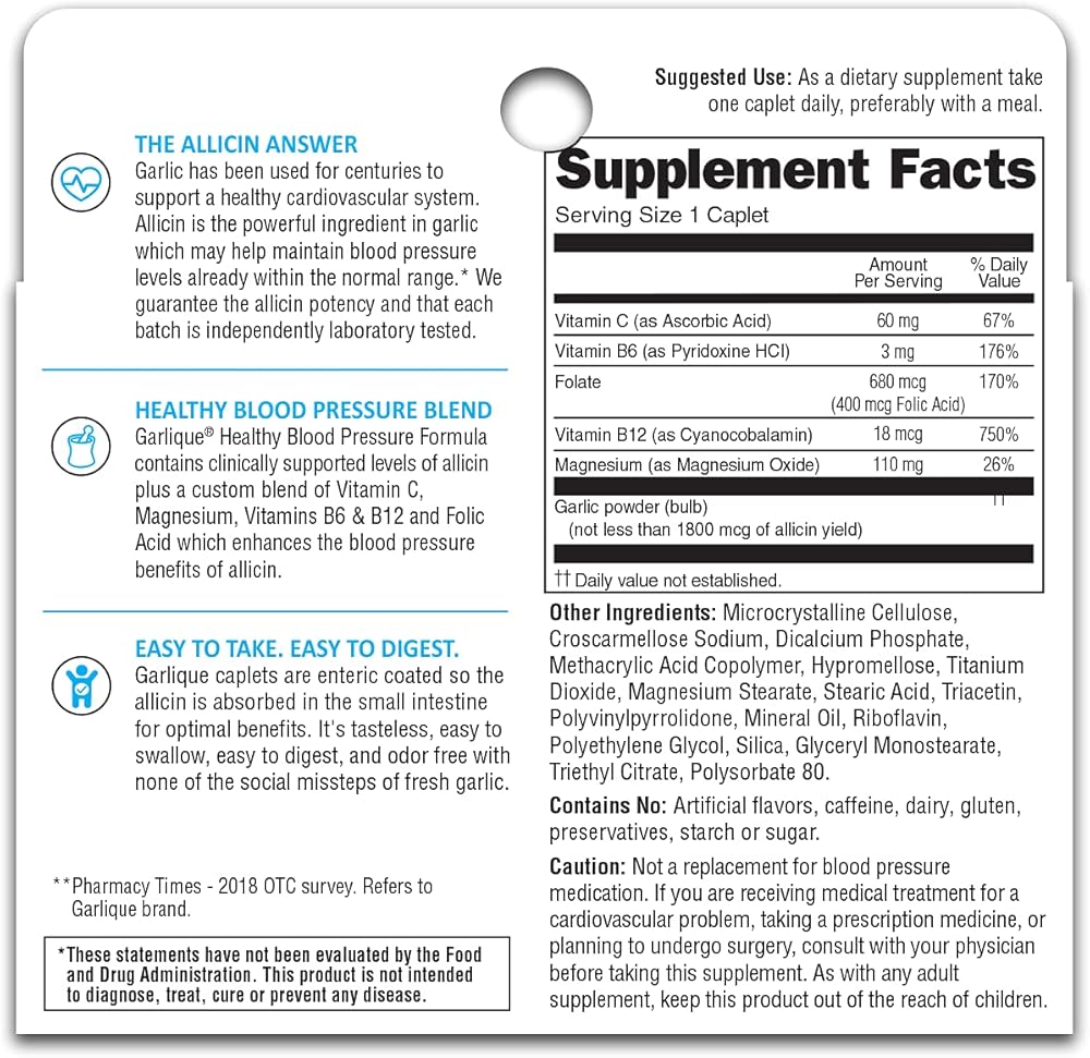 HEALTHY BLOOD PRESSURE BLEND: Contains clinically supported levels of allicin, the powerful ingredient in garlic that helps provide cardiovascular support, plus a custom blend of Vitamins C, B6 & B12, Magnesium, and Folic Acid to help support healthy blood pressure levels. ODOR-FREE: Garlic caplets are enteric-coated and absorbed in the small intestine for optimal benefits. They're odor-free, tasteless, and easy to swallow and digest, with none of the social missteps of fresh garlic cloves. And you just need one caplet per day.