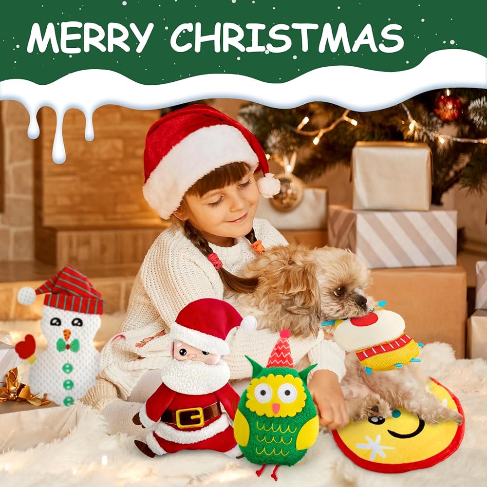 Christmas Squeaky Dog Toys 5 pack with cute animals, Santa Claus and Snowman plush dog toys. Various Christmas Elements makes these dog toys full of an atmosphere of Christmas. The Exquisite Handmade Embroidery makes these dog toys more vividly and lovely.