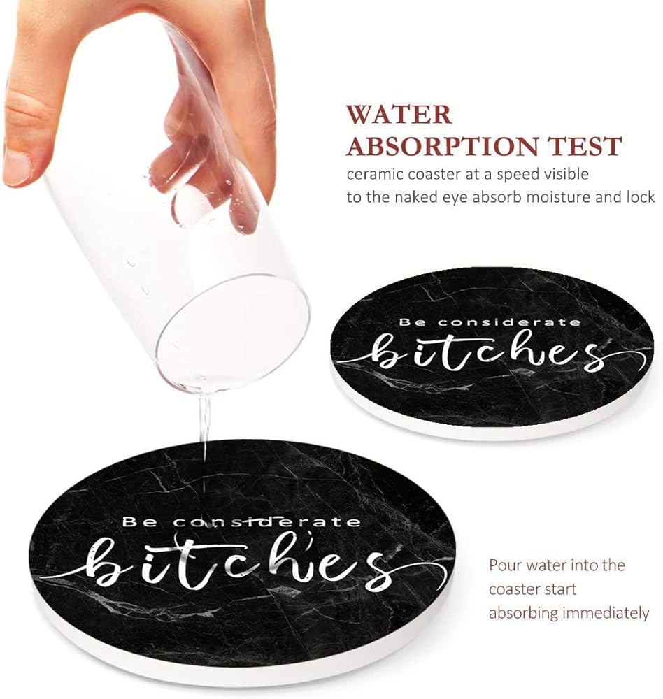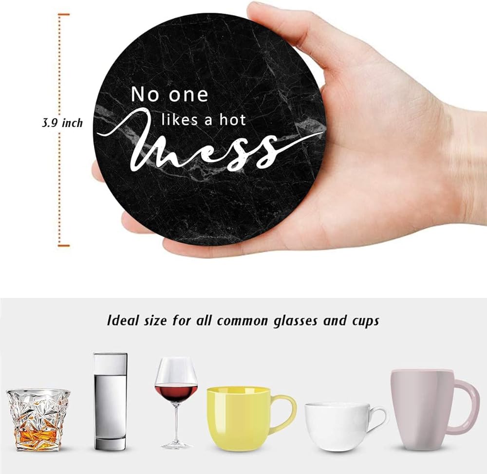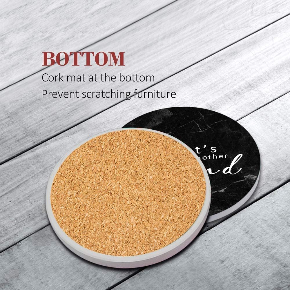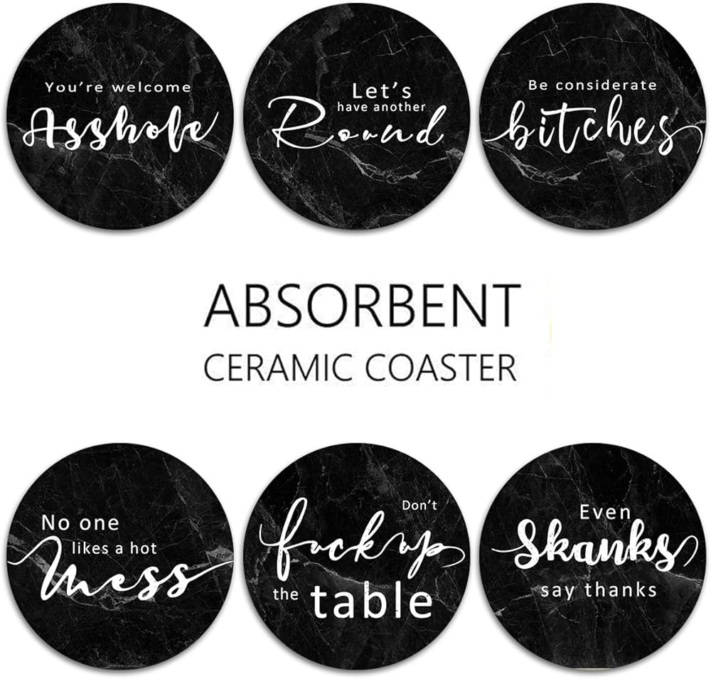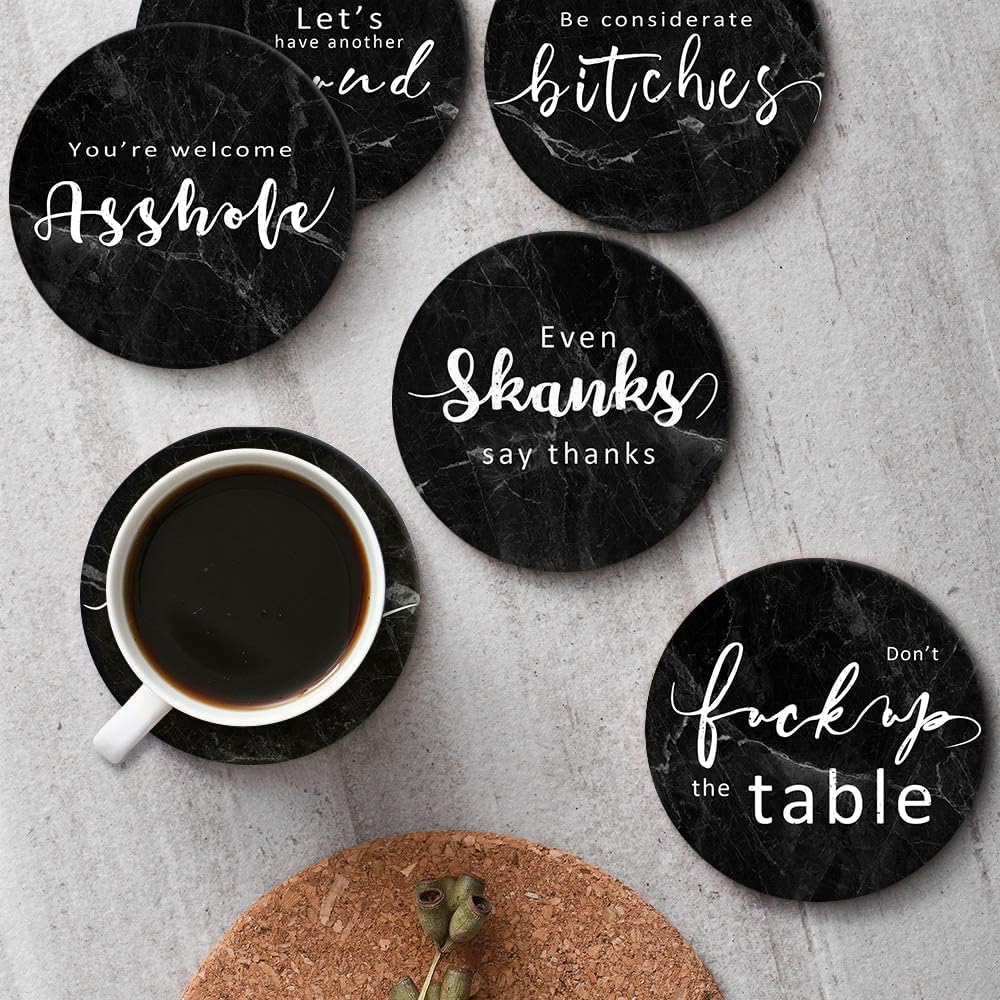 Coasters for Drinks Set of 6, Black Marble with Funny Quotes Sayings Absorbent Round Ceramic Stone Mat, with Cork Base and Metal Holder, Gift for Housewarming Room Bar Decor