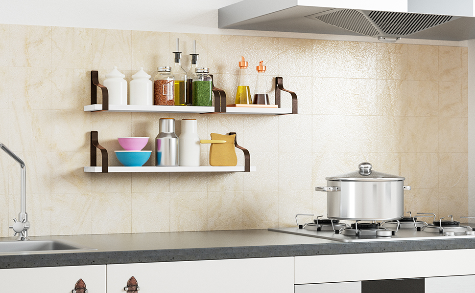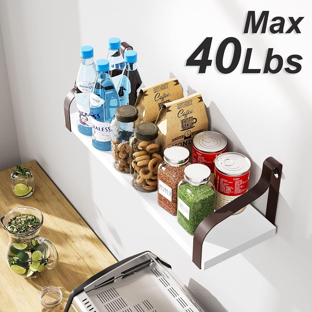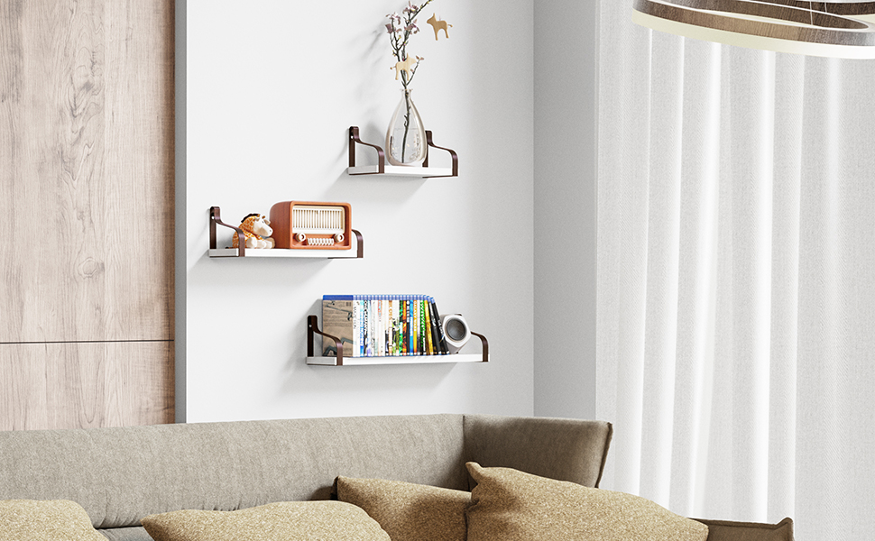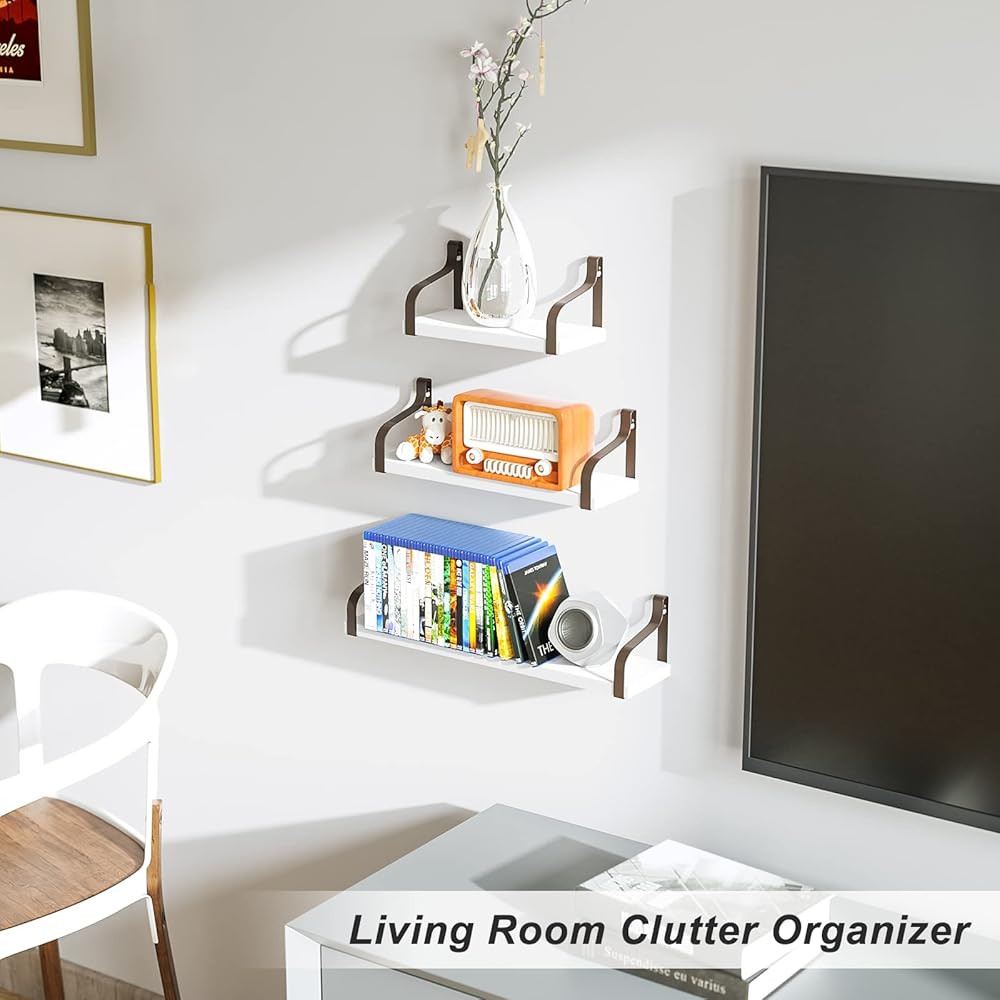 Love-KANKEI Floating Shelves Wall Mounted Set of 3, Rustic Wood Wall Storage Shelves for Bedroom, Living Room, Bathroom, Kitchen, Office and More White/Brown Bracket