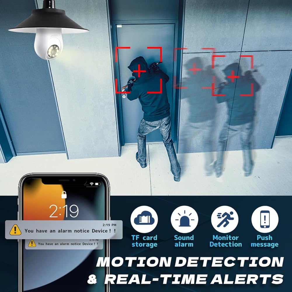 【Advanced Night Vision & Motion Detection】This light bulb camera upgrade the HD night vision function, and the infrared night vision and white light night vision can be switched freely, which makes the monitoring picture more colorful and enriches your visual experience. It adopts a highly sensitive motion sensor, once the camera detects the movement objects, it will record the moving picture and notify you through the App Automatically.