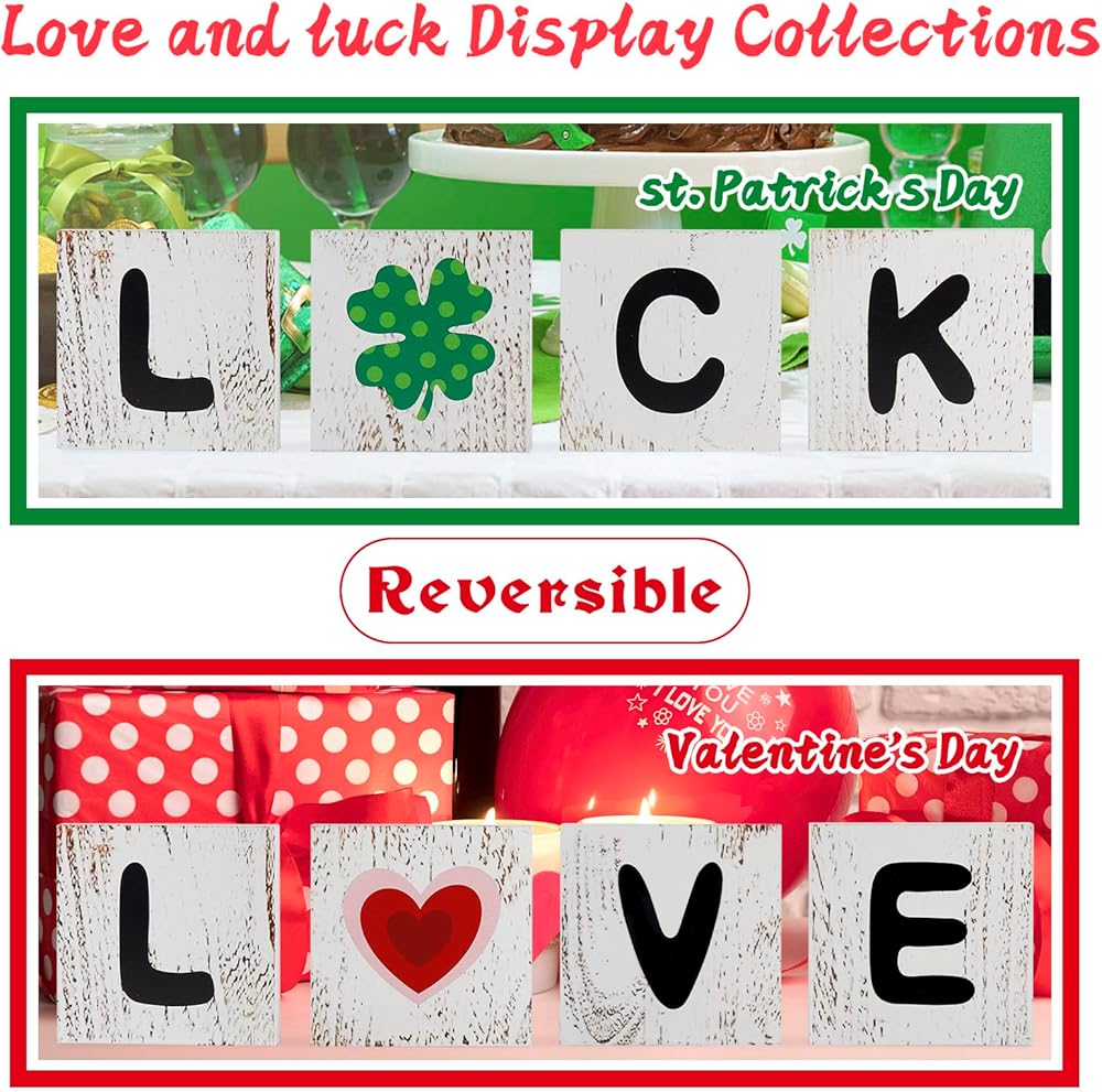 【Valentines Day Decor & St. Patrick's Day Decorations】This valentines day decor consists of a reversible block spelling “LOVE” on the one side and “LUCK” on another side. Printed with gorgeous heart patterns, these valentines decorations make tenderhearted affection waft through the air. When it comes to St. Patrick's Day, use another side to create green vigorous atmosphere.