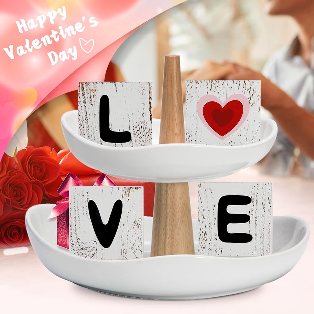 Valentine's Day Tiered Tray Decor, Reversible Self-Standing Wood Sign Decor for Table, Patrick's Day Decorations Farmhouse "LOVE" "LUCK" Block Decor for Tiered Tray Shelf, Set of 4