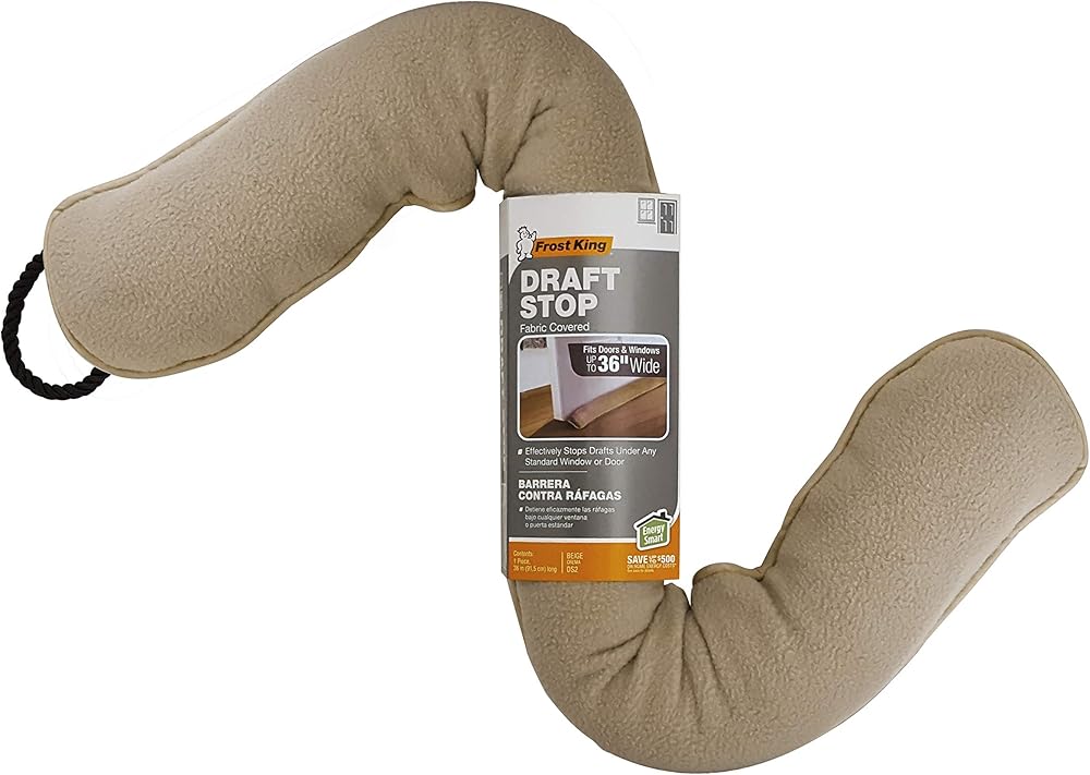 The Draft Stop is 36-inches long with exterior fabric made of tightly woven synthetic fleece and satin trim. It includes a woven satin handle for convenience. The fill is a nylon fiber and weighted with cotton bags filled with ground stone. The draft stop can be used on most doors and will slide with the door when it is opened and helps keep energy costs down.