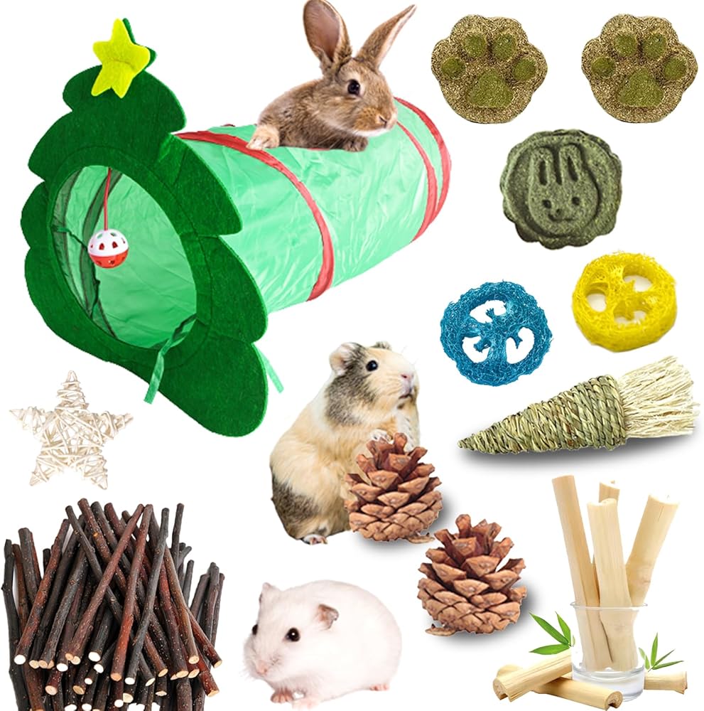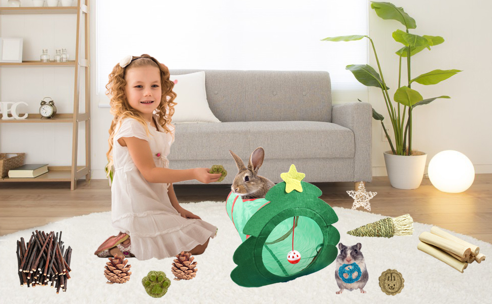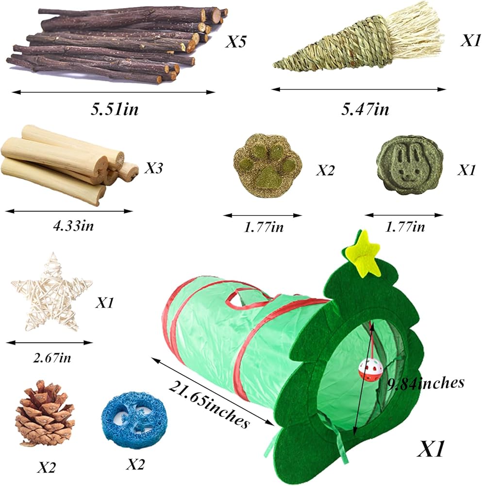 【Packge Include】Our rabbit toy set includes 1x rabbit tunnel(Size:21.65*9.84inch),1x round grass cake, 2x cute grass cake(Size:1.77inch), 2x loofah, 5 apple wood sticks, 3x sweet bamboo sticks, 1x pentagram, 1 x carrot(Size:5.47inch) and 2x pinecone.