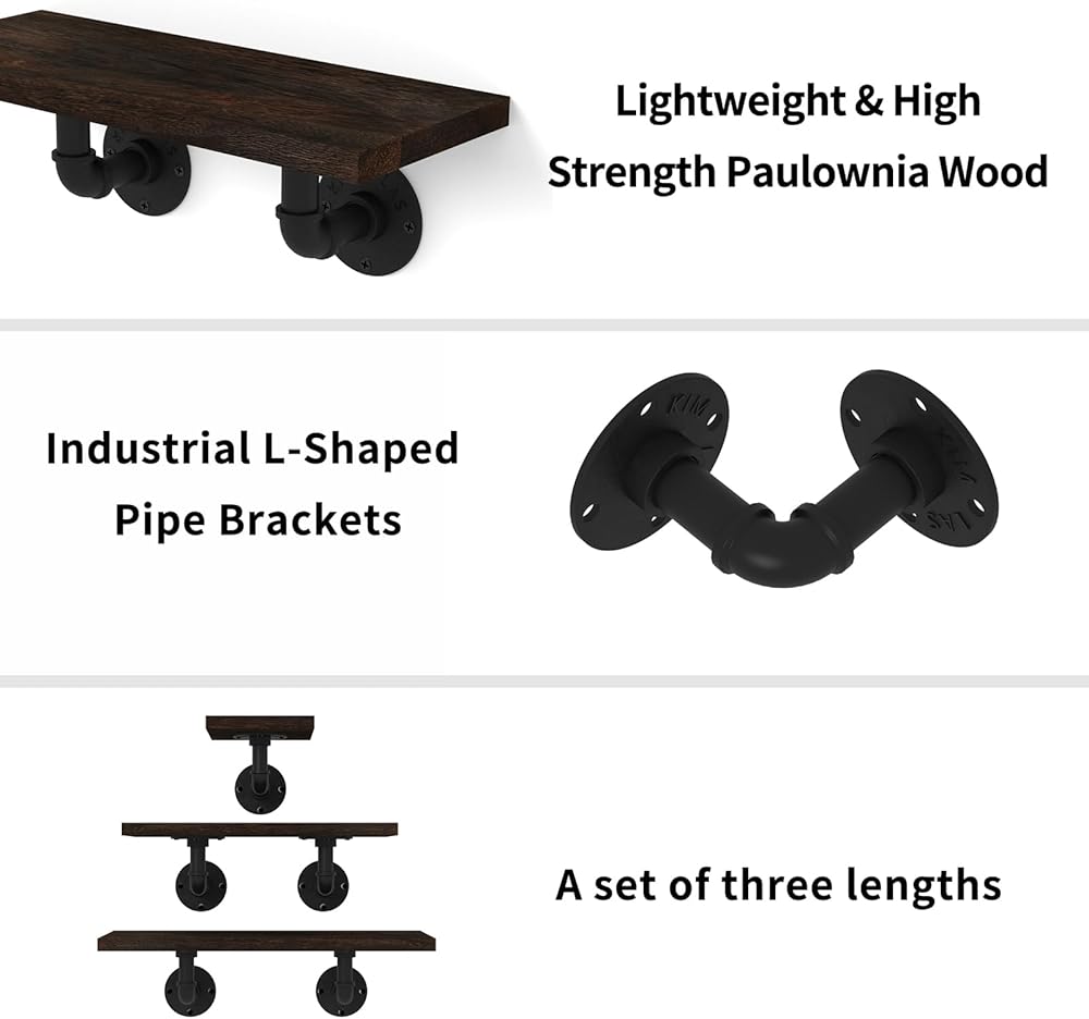 • Industrial Pipe Shelf: The floating shelves combine the natural, eco-friendly paulownia wood with iron pipes. These wall shelves are not only the perfect addition to rustic settings, but also add a touch of classic style to your home.
