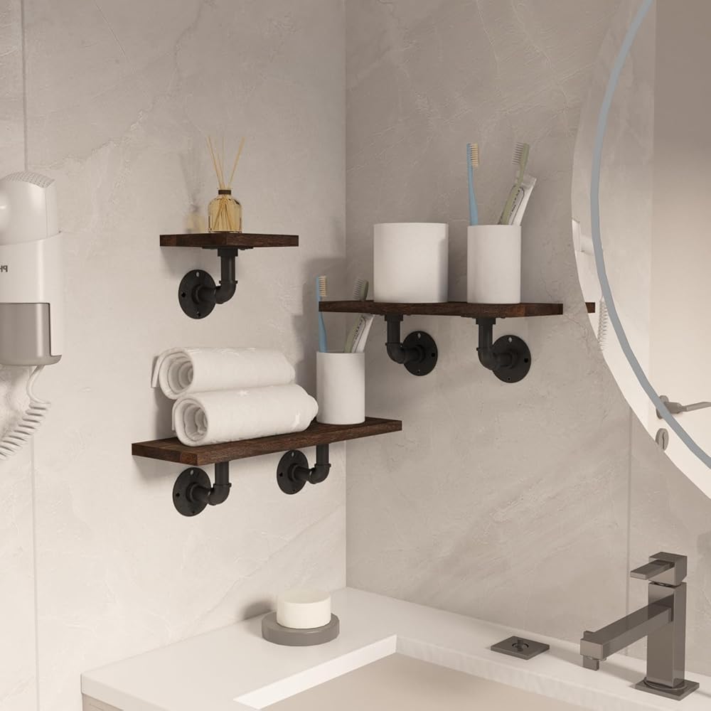 Edenseelake Industrial Pipe Wall Shelves, 3-Tier Rustic Wood Floating Shelves for Bathroom, Bedroom, Living Room, Kitchen, and Home Decor