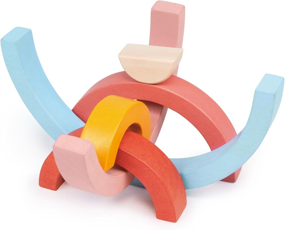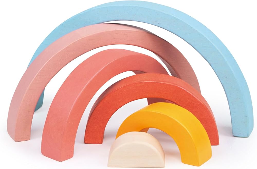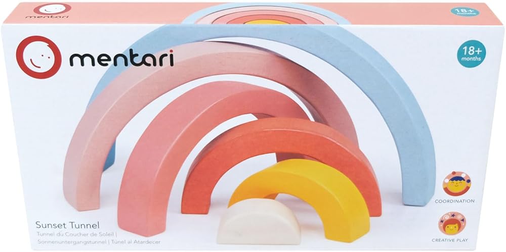 Transform playtime into a sensory experience with the Mentari Sunset Tunnel, a beautifully crafted wooden rainbow stacking toy for young explorers and tinkerers.
