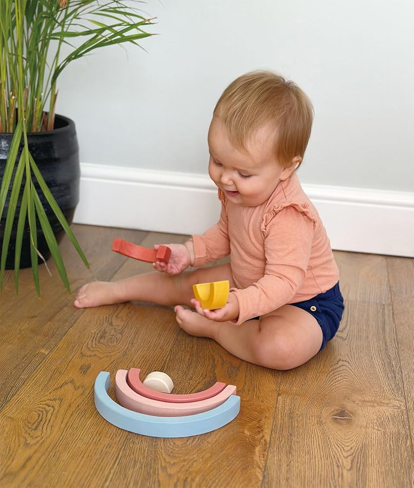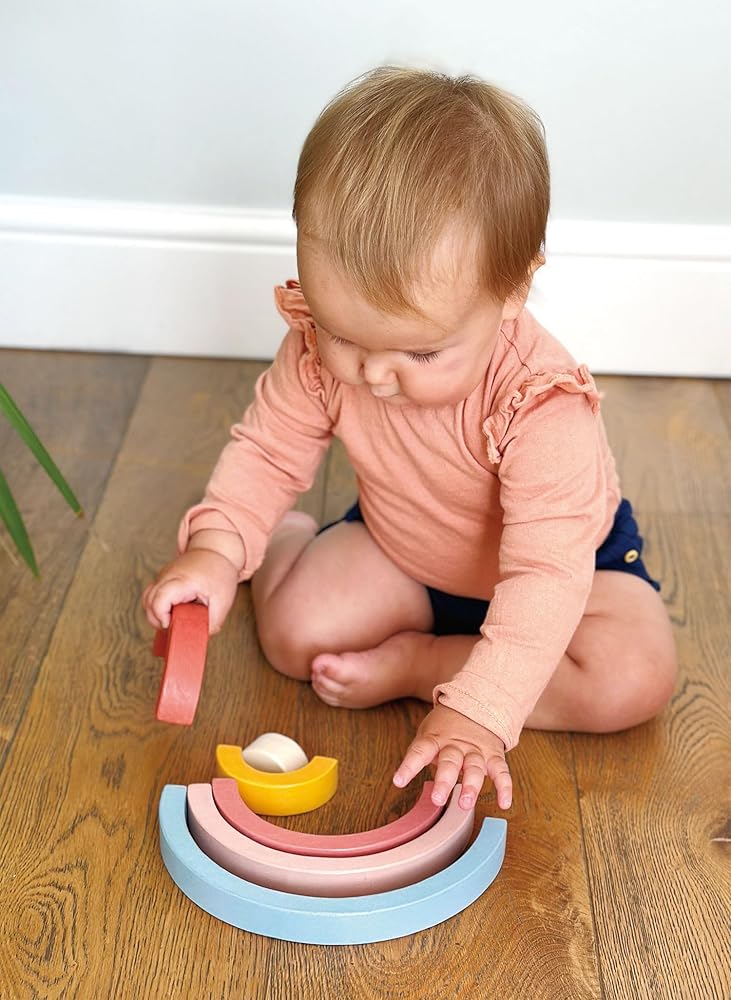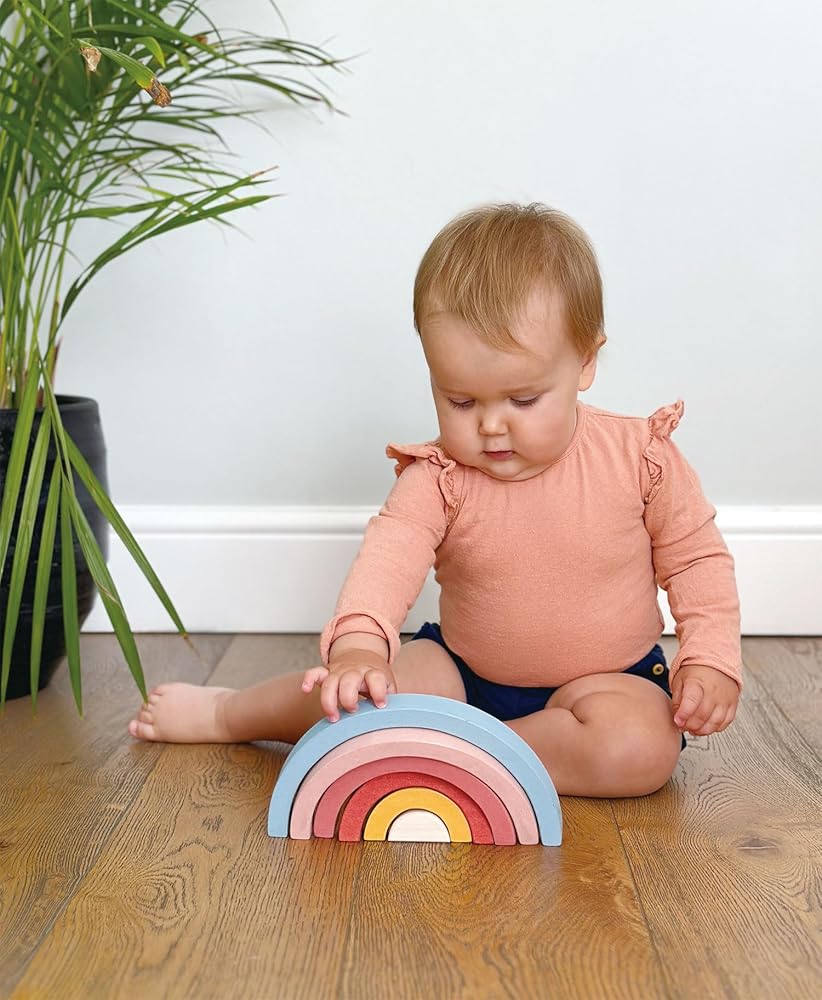 Embrace sustainability with the Sunset Tunnel, a rainbow baby toy made from durable rubber wood, a material known for its environmental friendliness and long-lasting quality.