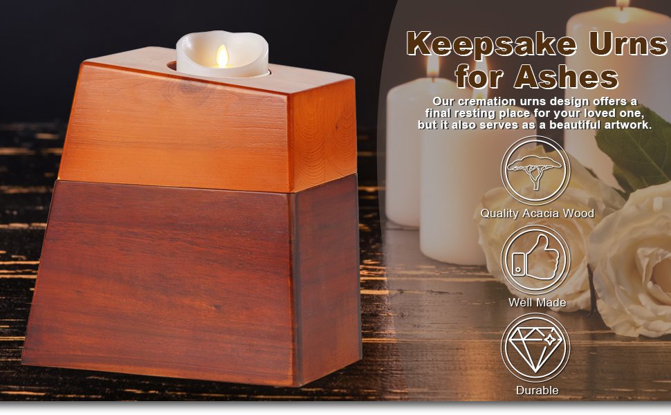 Excellent in Quality: Cremation urns are all handmade from high quality Acacia wood with a clear grain and unique craftsmanship. Beautiful timeless wood grain finish will warm your heart as well as give your loved ones the quality they deserve.