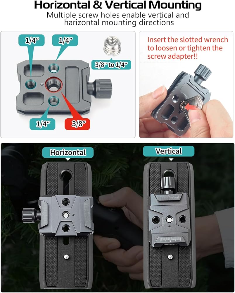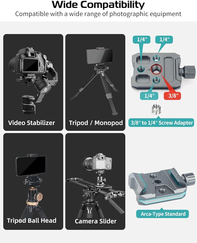 🎬🎬 Package Contents & Note for Use 🎬🎬 ❶ The Package includes: [1 x ] Arca Type Quick Release Clamp, [1 x ]3/8” to 1/4” Screw Adapter, [1 x ] Hex Wrench, [1 x ] Slotted Wrench, [1 x ]Anti-slip Screw ❷ The installation of the product is easy and simple, you can refer to the instruction on the picture. If there are any questions, please feel free to contact us.