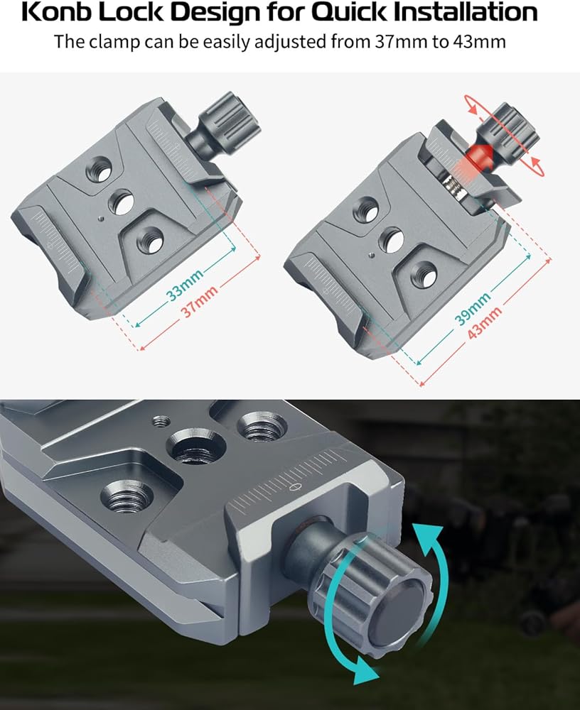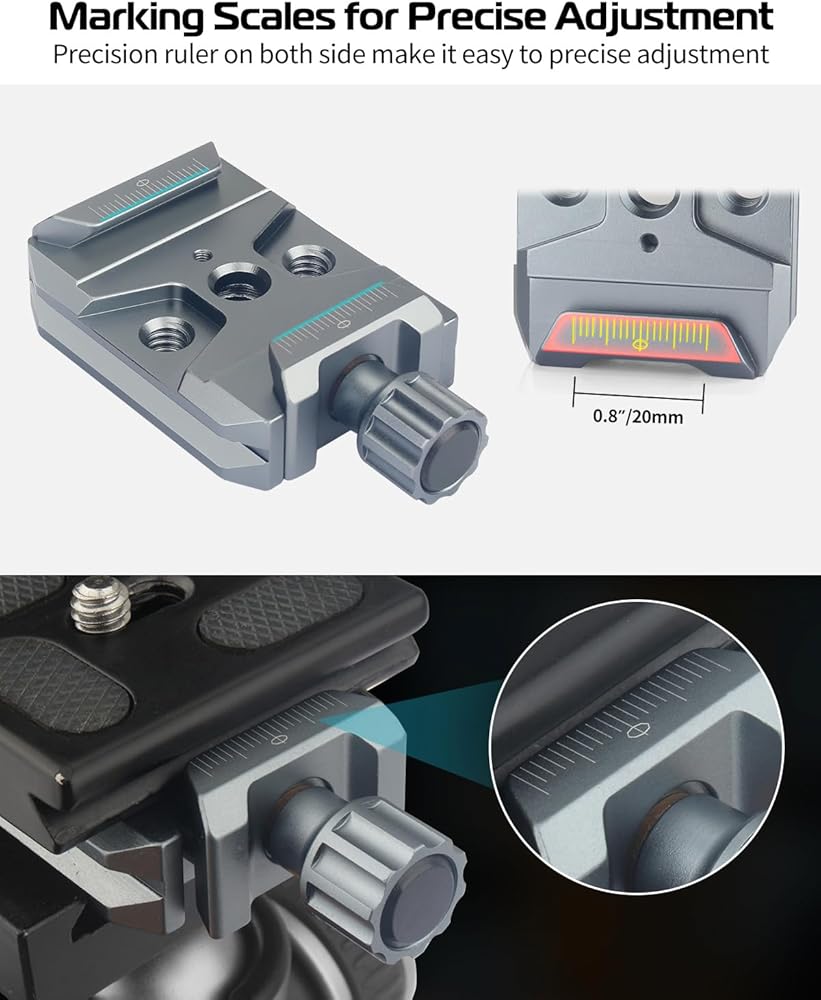 🎬🎬Quick &Precise Adjustment🎬🎬 ①The Arca-type clamp is equipped with a non-slip knurled knob. By rotating the knob, you can easily adjust the distance of the clamp and quickly secure the photography equipment. ②Engraved scales on both sides of the clamp allow precise adjustment of the camera position within 0.8” (20mm), allowing you to rebalance easily and quickly when removing and reinstalling the camera on the ball head / stabilizer.