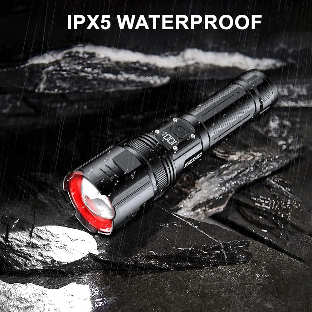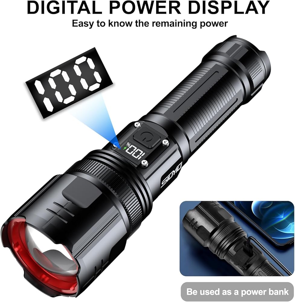 【POWERFUL DIGITAL POWER DISPLAY】 - The Rechargeable high powered LED flashlight comes with a digital display screen, which shows the battery level and charging status, allowing you to keep track of the power status at all time.
