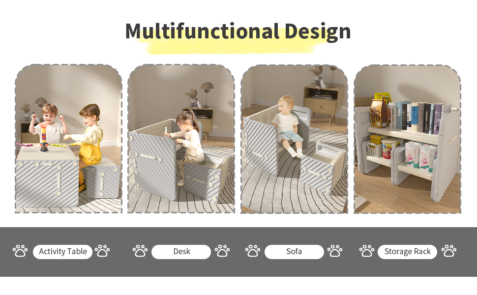 Multifunctional Design: Create various arrangements for different needs. Use it as an activity table, study desk, sofa, bookshelf, art station, or even a playtime hub.