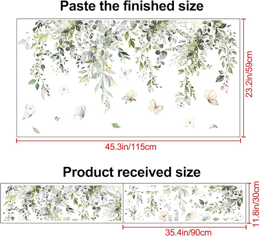 The green vine decals on the wall is really great decorations for any smooth wall or window decorations, holiday party supplies. Add some color to your room, create a cute and lively atmosphere. Finished Size: 45.3” x 32.3” / 115cm x 59cm. This green vine leaf wall decals include 2 sheets. Each size: 12” x 36” / 30cm x 90cm.