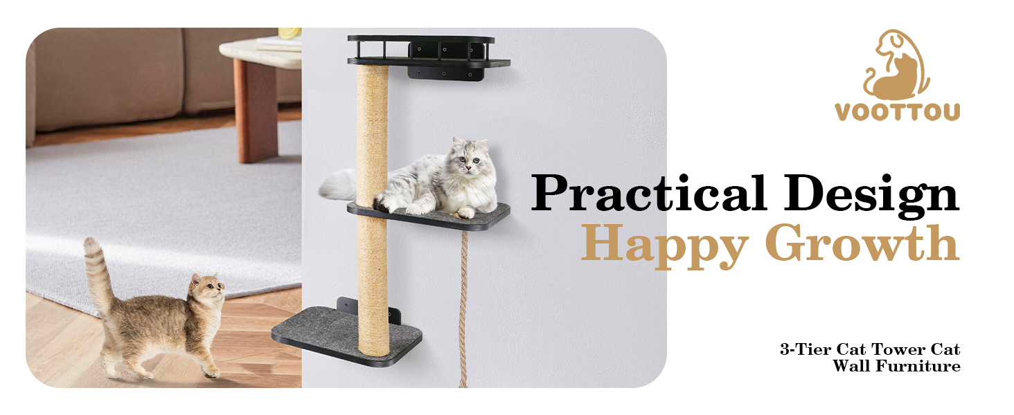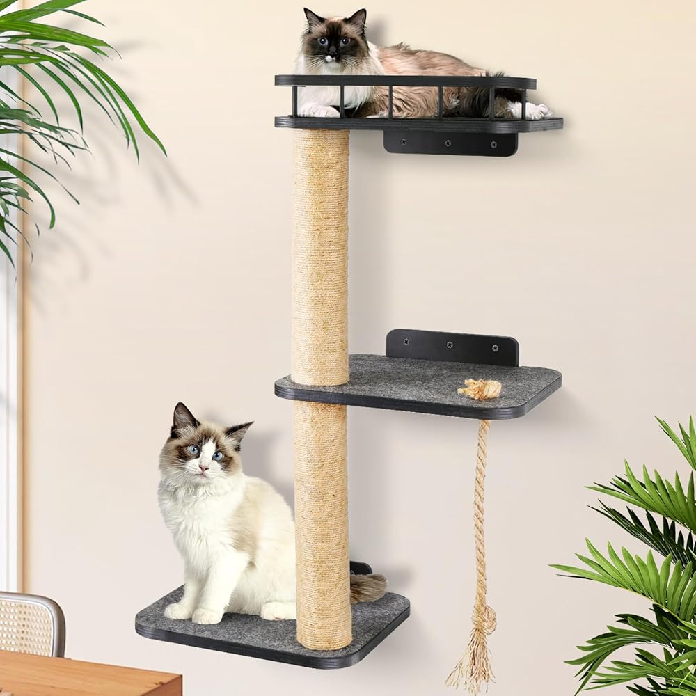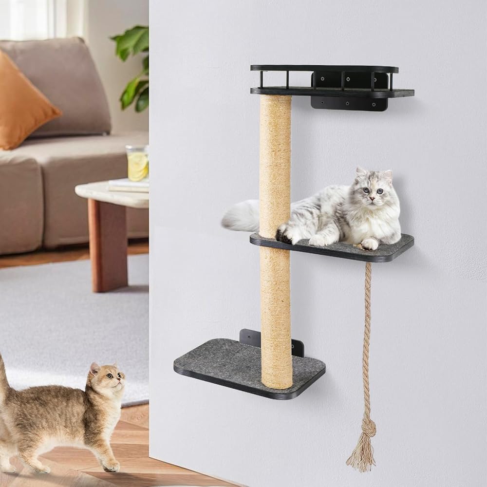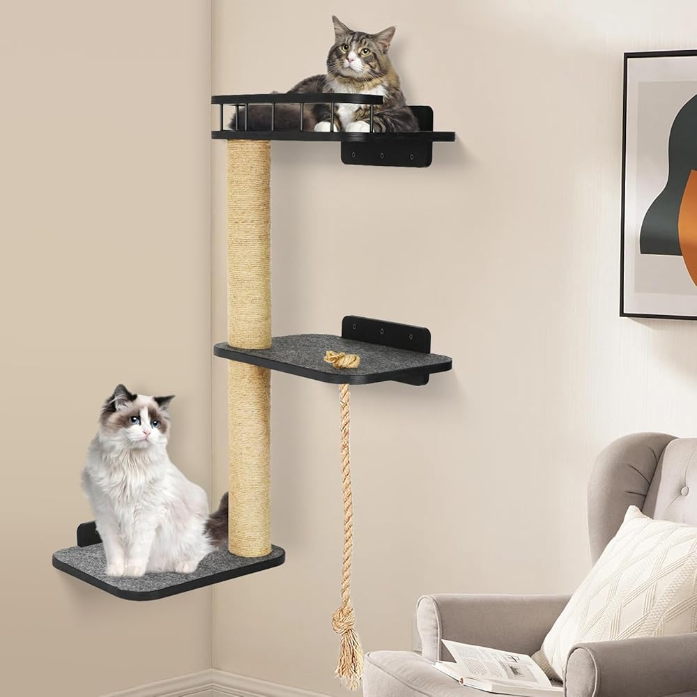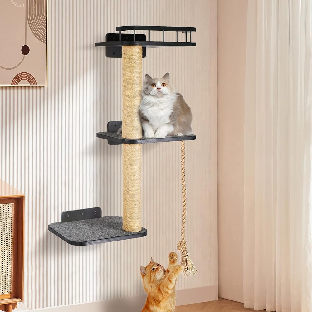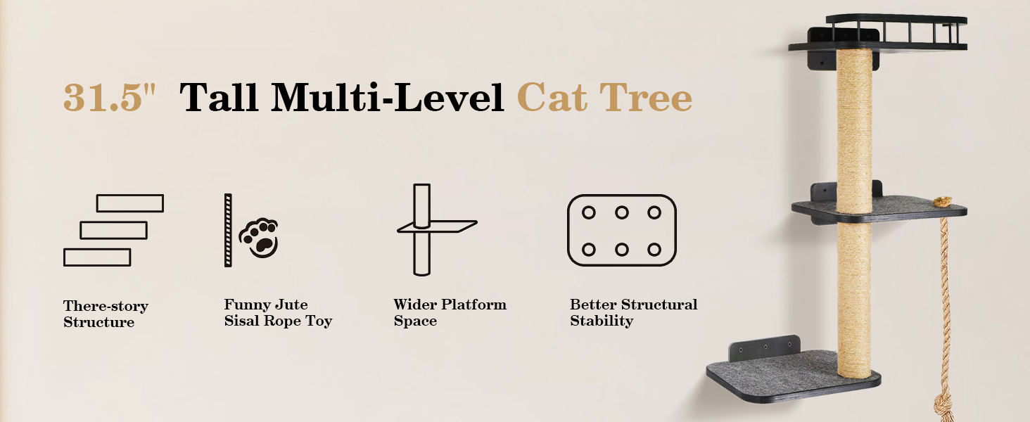 🐾Three-tiered Cat Tree Tower : Our cat wall shelves consists of a three-layer platform and two hemp rope posts. The top cat shelf is designed with railings, which increases the aesthetics and ensures the safety of cats. The surface of the cat shelf has soft felt pads, so cats can lie down and rest comfortably on the shelf. The height of the two hemp rope posts is neither high nor short, which is in line with the cat's nature.