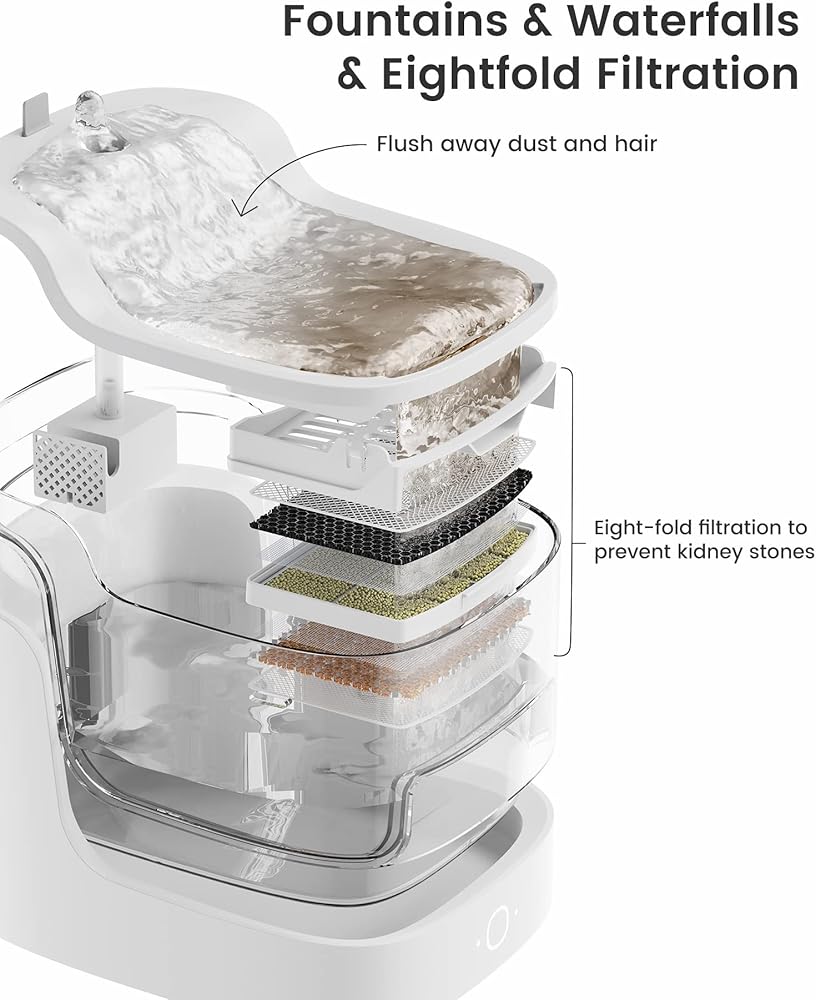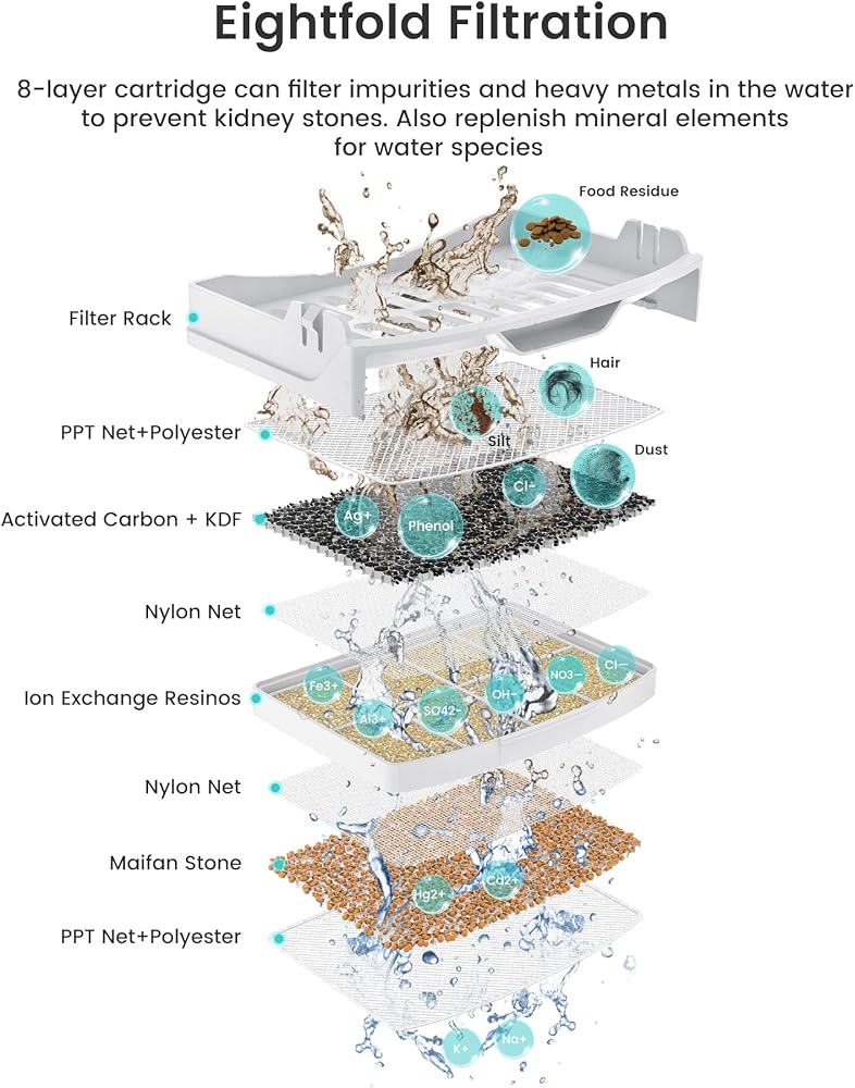 Eight-Layer Filtration: Utilizing 8-Layer filter components and a high density micropore filter, filters remove pet hair and most other impurities, gives your pet healthy and clean water.
