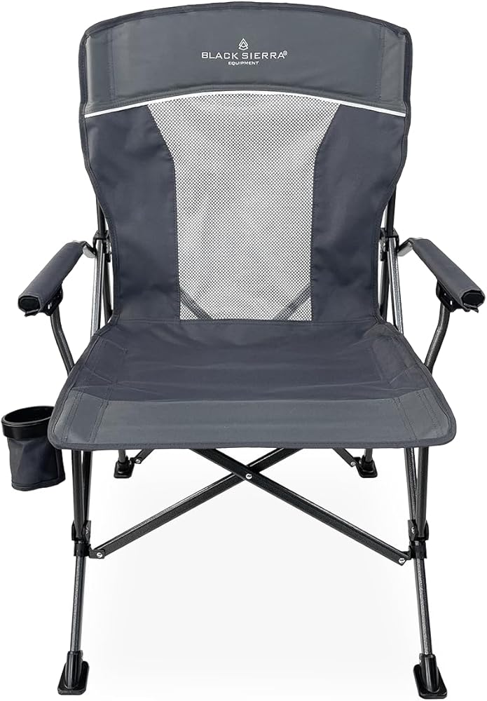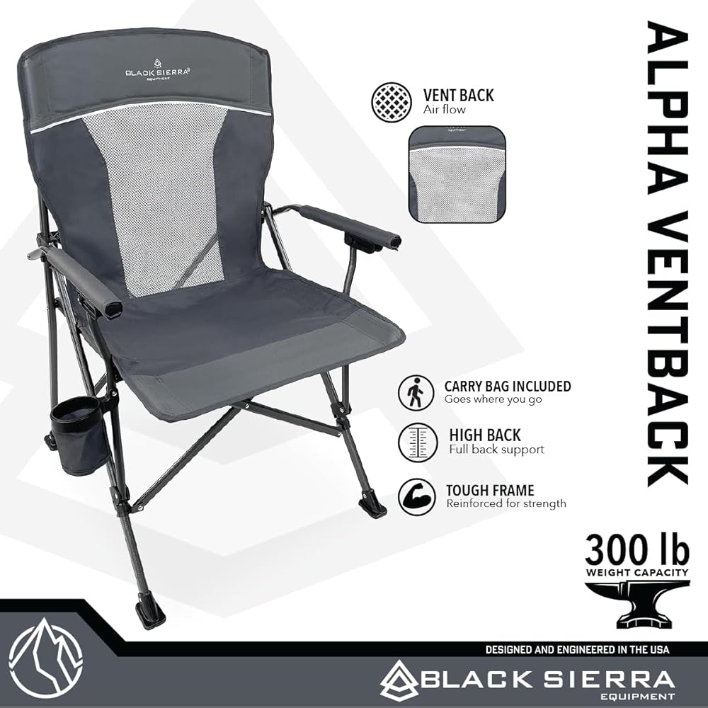 Black Sierra Folding Camping Chair, Heavy Duty High Back Lawn Seat with Padded Armrests & Mesh Vent Back, Portable for Yard and Beach Comes w/Cup Holder and Carry Bag, Supports 300 lbs.