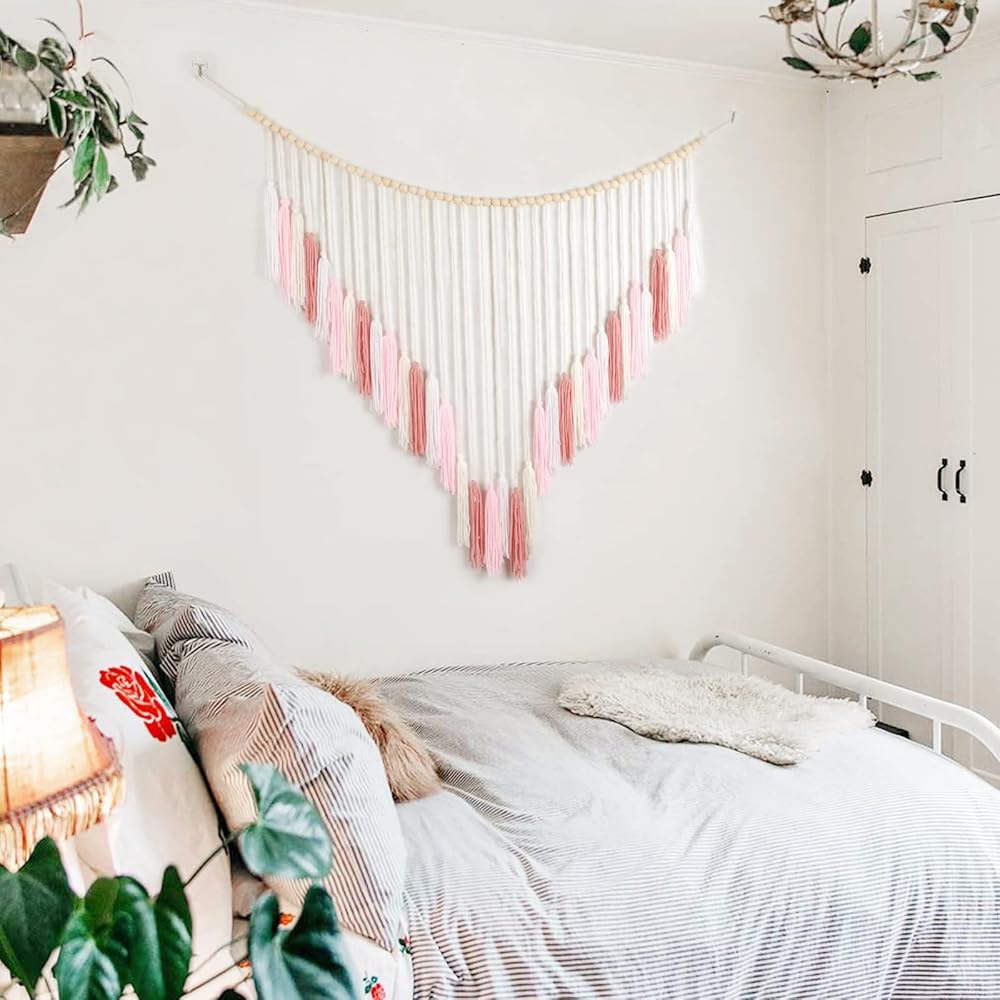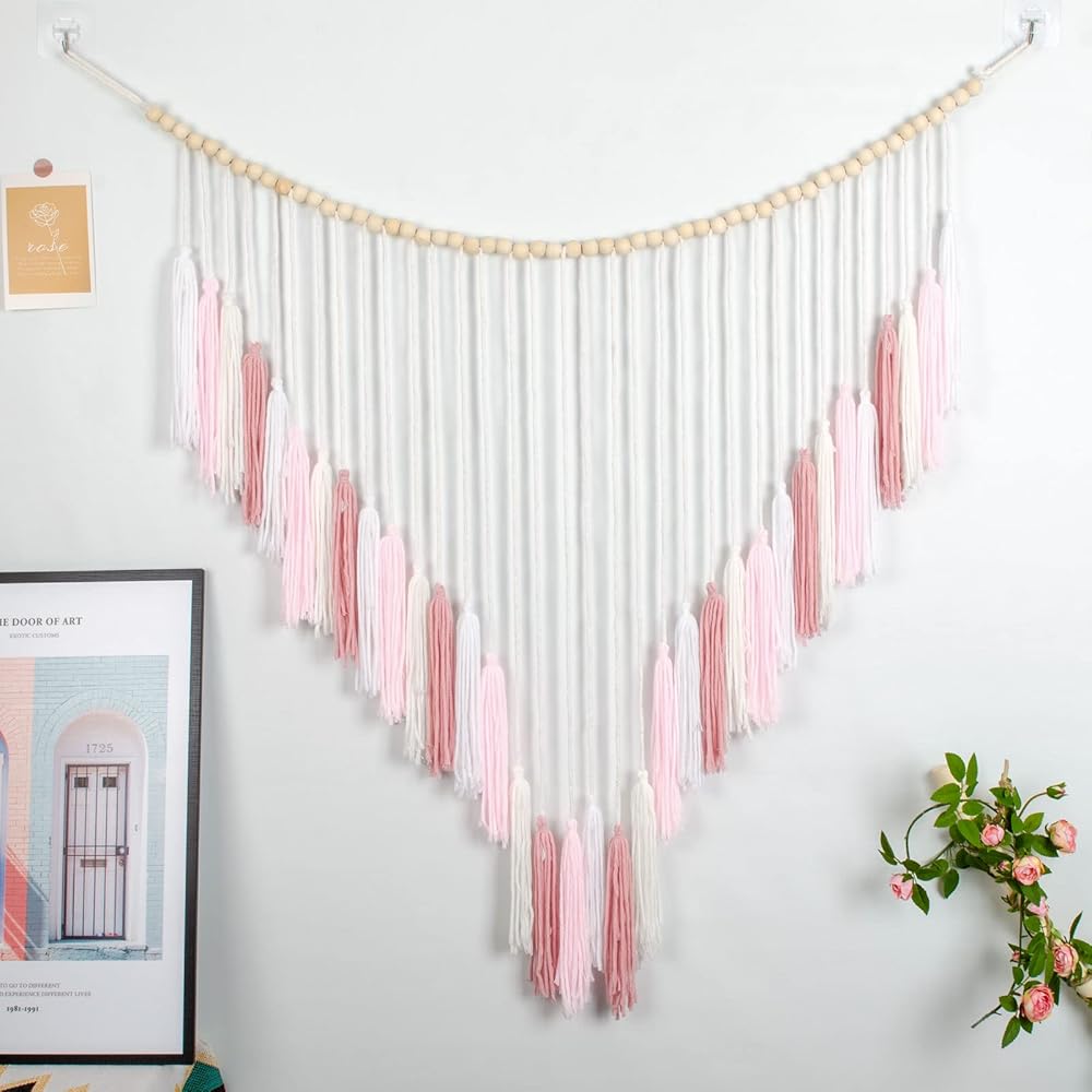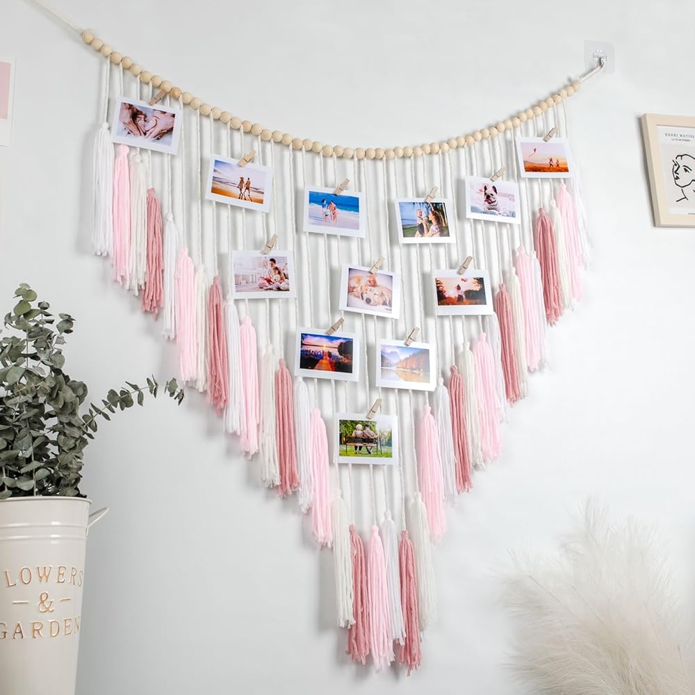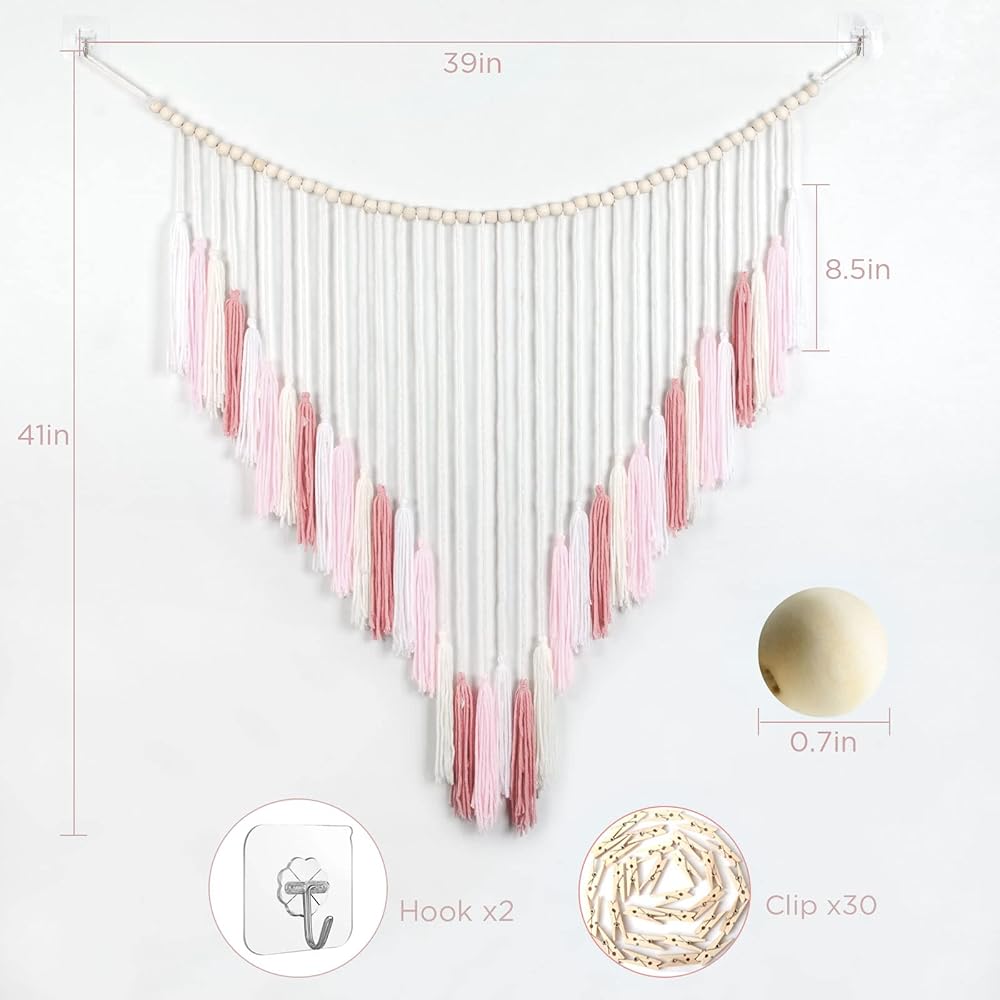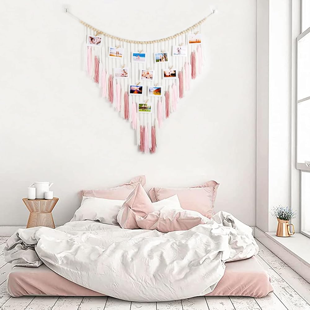 Macrame Wall Hanging with Wood Beads - Bohemian Wall Decor for Bedroom, Living Room Kitchen Home Decor Room Decor Boho Wall Hanging Decor, Gifts for Women Photo Display Cilp Holder Pink 35'' X 36''