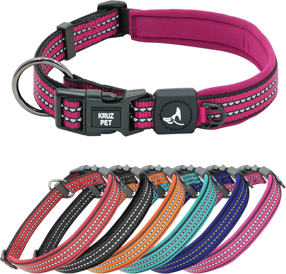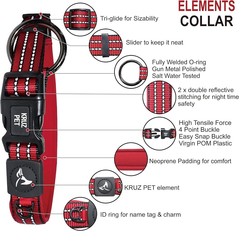 Kruz PET Reflective Dog Collar, Nylon The Kruz PET Reflective Dog Collars promotes safety all the way around. Featuring a heavy duty, fully welded O-ring which allows for an easy attachment of a leash. A breakaway system ensures your dogs safety so that they cannot slip out of the leash. This reflective nylon dog collar reflects light, so as to keep you and your dog safe and boost visibility at night. The 2mm visible reflective thread design woven into the collar is perfect to keep you both visible while on your evening or late night walks. An easy on and easy off, durable side release buckle allows it to withstand high tug pressure. The adjustable tri-glide reinforces custom fits. The best adjustable pet collar for training or taking your best buddy on a stroll with comfort and ease. Perfect for dogs of all shapes, breed, and sizes. Pair the collar with one of our reflective leashes for a sophisticated look that comes in a wide range of bright color combinations that are easy to see at all times. Design Features: Hi-quality 100% nylonHigher tensile strength than polyester2mm reflective threadHeavy duty D-Ring for leash and ID tagUltra-sturdy plastic buckleTri-glide for easy size adjustment Soft comfortable Neoprene Padding