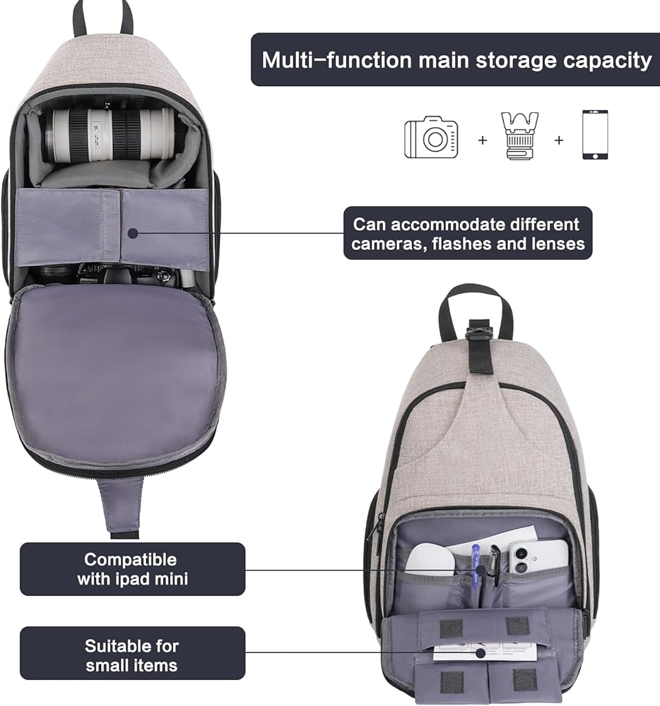 Flexible satchel shoulder strap can be adjusted loose or tight to fit your body. Two shoulder straps are connected by a durable zipper, can easily change this bag from a backpack to a sling bag. Can be used as camera sling bag, camera crossbody shoulder bag, camera backpack daypack. Meanwhile breathable mesh back panel is extremely comfortable and lightweight, which will release heat rather than accumulate, keep your back dry. 1 year warranty on each camera bag.