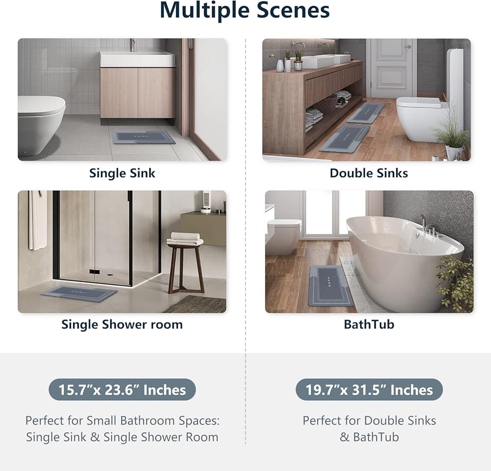 🇺🇸【MULTIPLE SIZE CHOICES】: The super absorbent bath mat has four size to choose: 1.Small:23.6”x15.7”;2.Medium:27.5”x17.0”;3.Big:31.5”x19.7”;4.Long: 59”x17.7”. Small or Medium is perfect for small spaces of bathroom, such as under single sink or out of single shower room. Big Size is for bigger bathroom, such as under double sinks or bathtub. Long Size is suit for kitchen or big shower room&bathtub. Choose the right size according to the space & structure of your bathroom before purchasing.