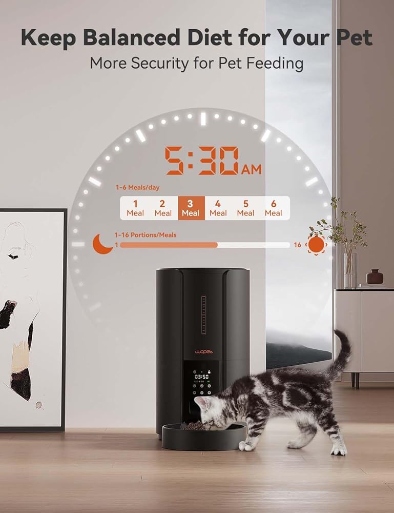 Schedule Feeding Plan: With WOPET automatic cat feeders, you can set 1-6 meals per day and up to 8 portions per meal to customize a healthy diet for your pets. No more pre-dawn wake-up calls, or excessive worries when overtime at night and travel. wopet automatic pet feeder will dispense food with right portions at right time!