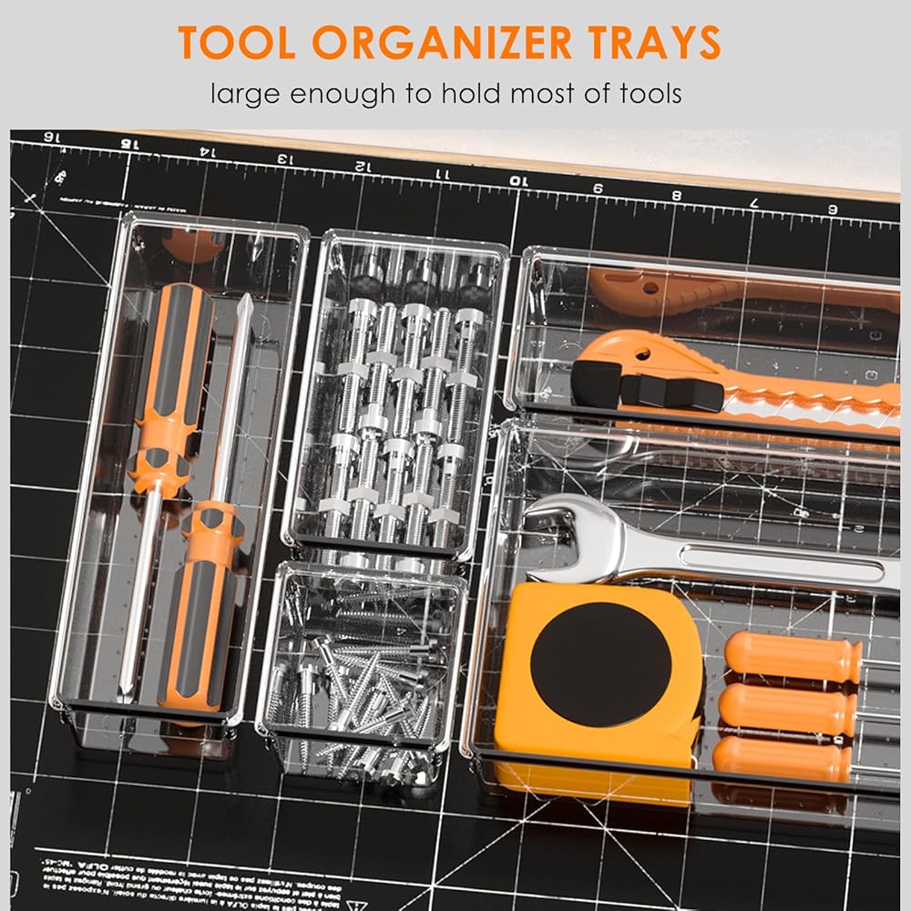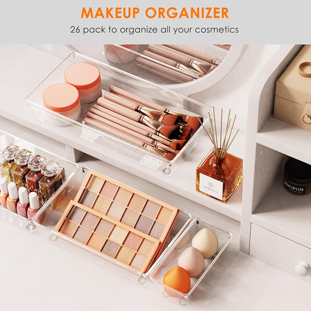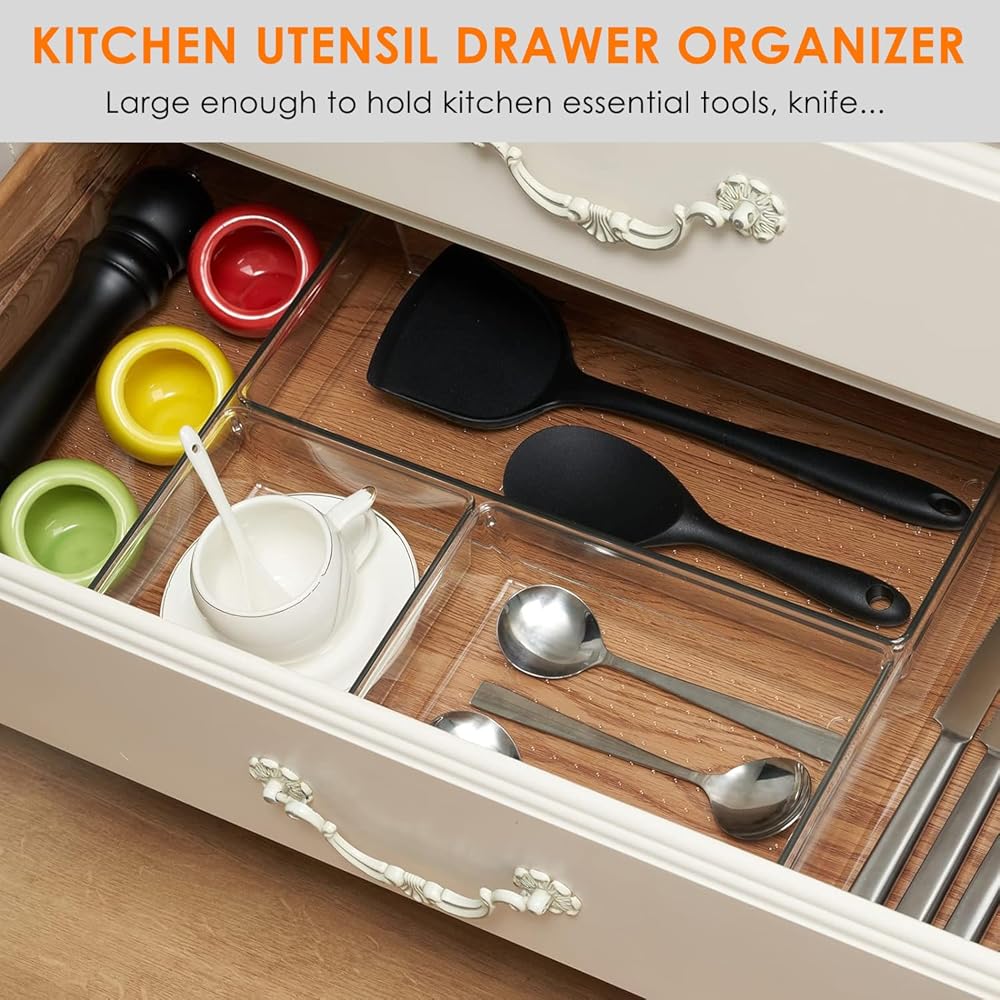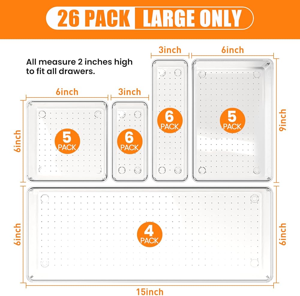 【LARGER SIZES】With 5 different sizes, our 26 pack clear drawer organizers could hold more gadgets, large and long enough to hold kitchen utensils, silverware, household tools and more. Includes: 4 pack large drawer organizer trays 15x6x2 inches, 5 pack 9x6x2 inches, 5 pack 6x6x2 inches, 6 pack 6x3x2 inches, 6 pack 9*3x2 inches.