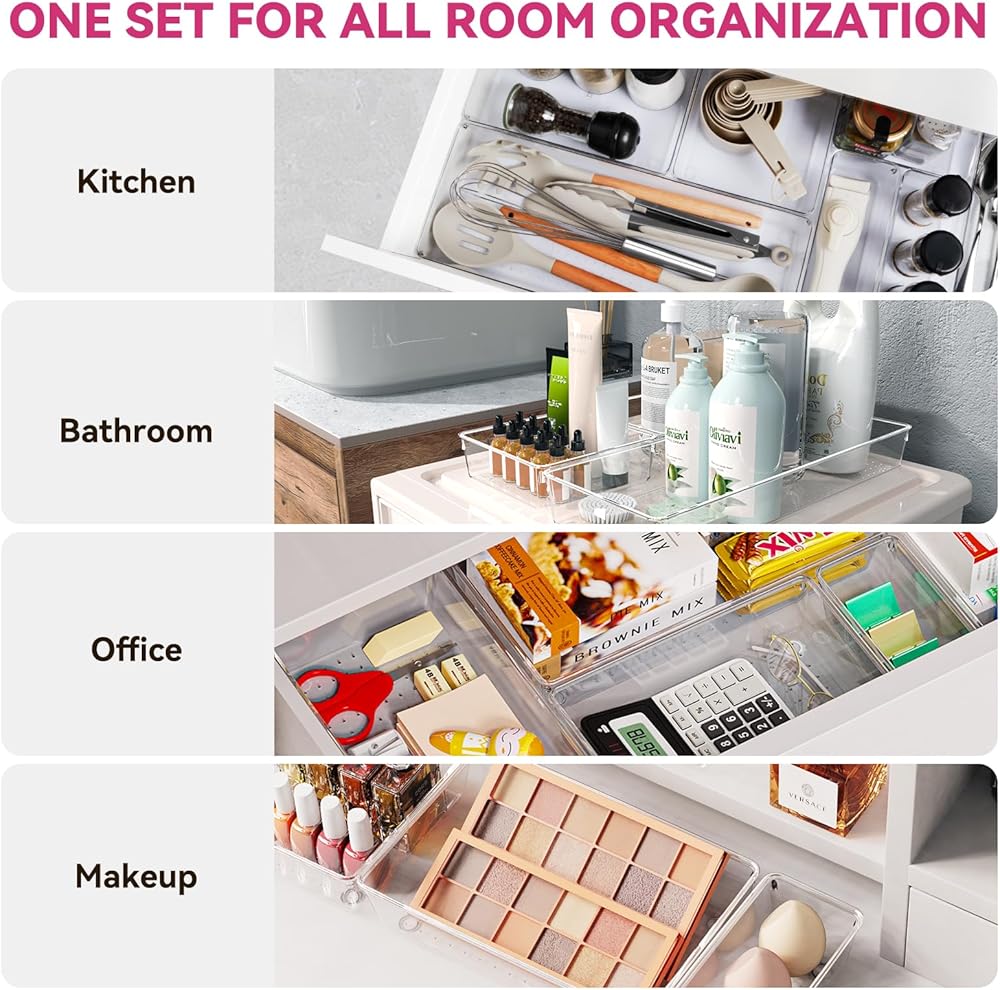 【MULTI-USE】Measuring 2 inches high, these clear drawer dividers trays could fit with all kinds of drawers, such as vanity/bathroom/kitchen/office drawers/ craft room, ideal for organizing cosmetics, makeup tools, hair accessories, jewelry, pins, office supply, craft supplies, utensils, etc.