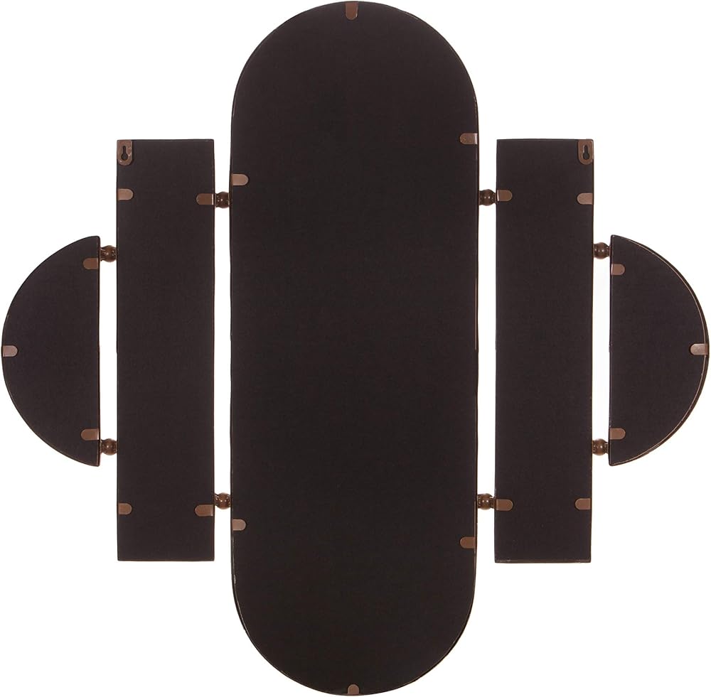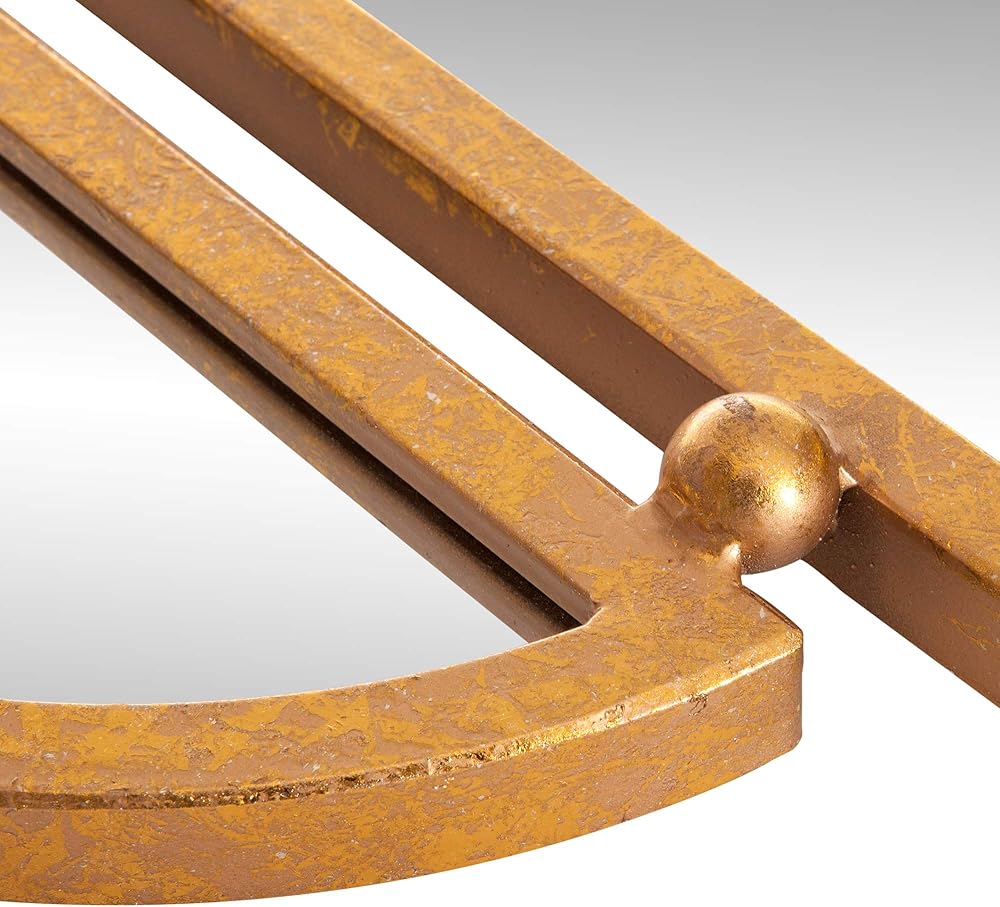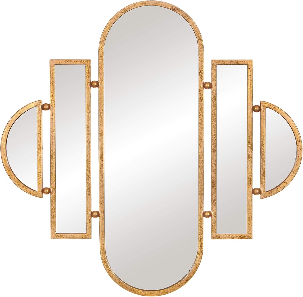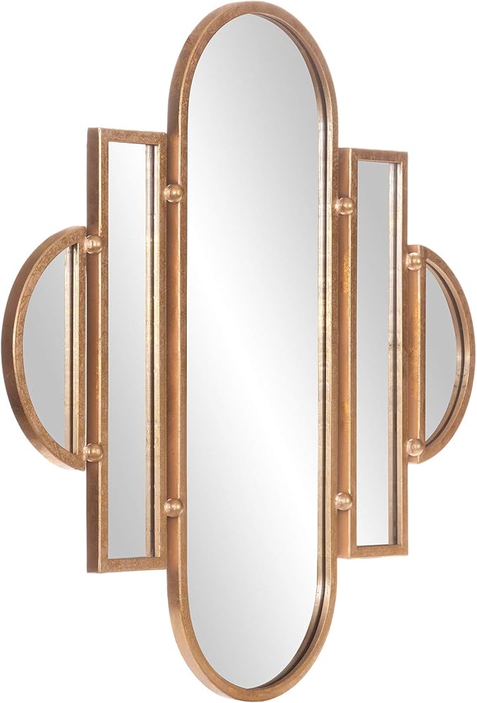 This 30x31 Antique Gold Geometric Oval Vanity Wall Mirror is framed in a gorgeous textured antique gold foil in geometric cut out design. It's vintage inspired silhouette is the perfect blend of classic glamour style. This mirror is both polished and sleek that effortlessly pulls any room together. Hang securely to any wall surface with industrial hangers on the back that make installation a snap. Intended for vertical display that would make an excellent vanity mirror to add an antique heirloom quality to your decor. Brighten up your space by placing this meticulously crafted mirror into your living room, entryway or bedroom. Frame measures 30. 5 inches tall x 31 inches wide and mirror inner measures 29. 5 inches x 30 inches.