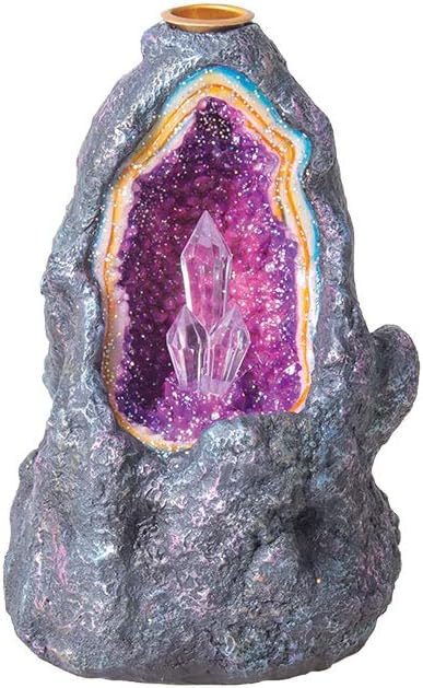The Crystal Cave Backflow Incense Burner is a 6.5 inch polyresin incense burner specifically made for holding backflow style incense cones. Intricately decorated just like a cracked-open geode. The incense burner has a built-in LED light powered by two AA batteries (sold separately). Includes a single cone of incense and a metal holder insert.