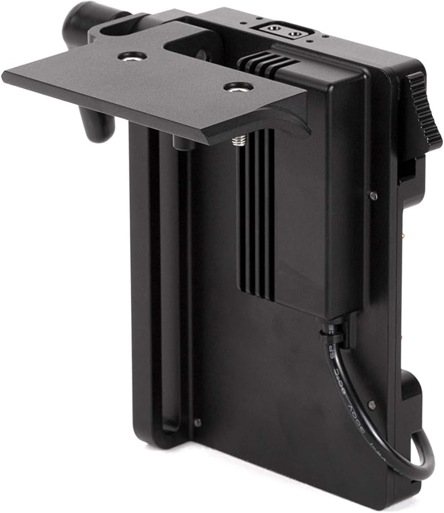 Battery Slide Pro V-Mount (Sony FX9) utilizes a WC Pro V-Mount plate which converts battery voltage to 19.5V for the camera, FX9 barrel connector, and a custom Battery Slide which attaches directly to the back of the camera without rods. This system retains access to the battery compartment and allows an internal BPU battery to be installed, giving the user the ability to hot swap V-Mount batteries. To adjust battery plate position, loosen the thumbscrew and slide. Perfectly fits rear profile of the Sony FX9 for compact packing in camera case. Features 3x D-Tap ports at battery voltage for accessory power and digital fuse which cuts off accessory outputs should they exceed the set current while leaving the camera powered.