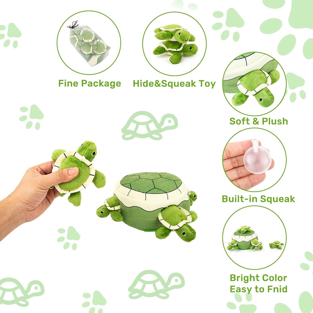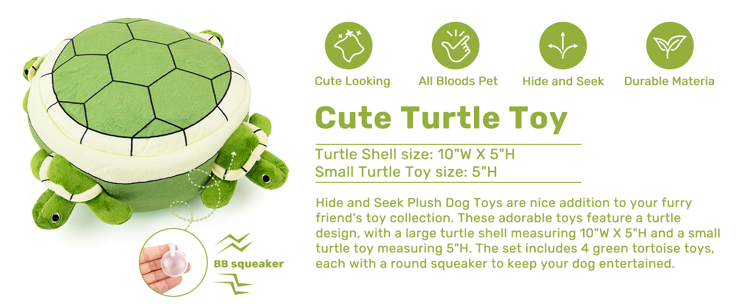 Tortoise size: 4 x 3 inches, providing a compact and lightweight toy for your dog to enjoy. Green Shell size: 8 x 8 inches, offering a sturdy and cute base for the hide-and-seek playtime.