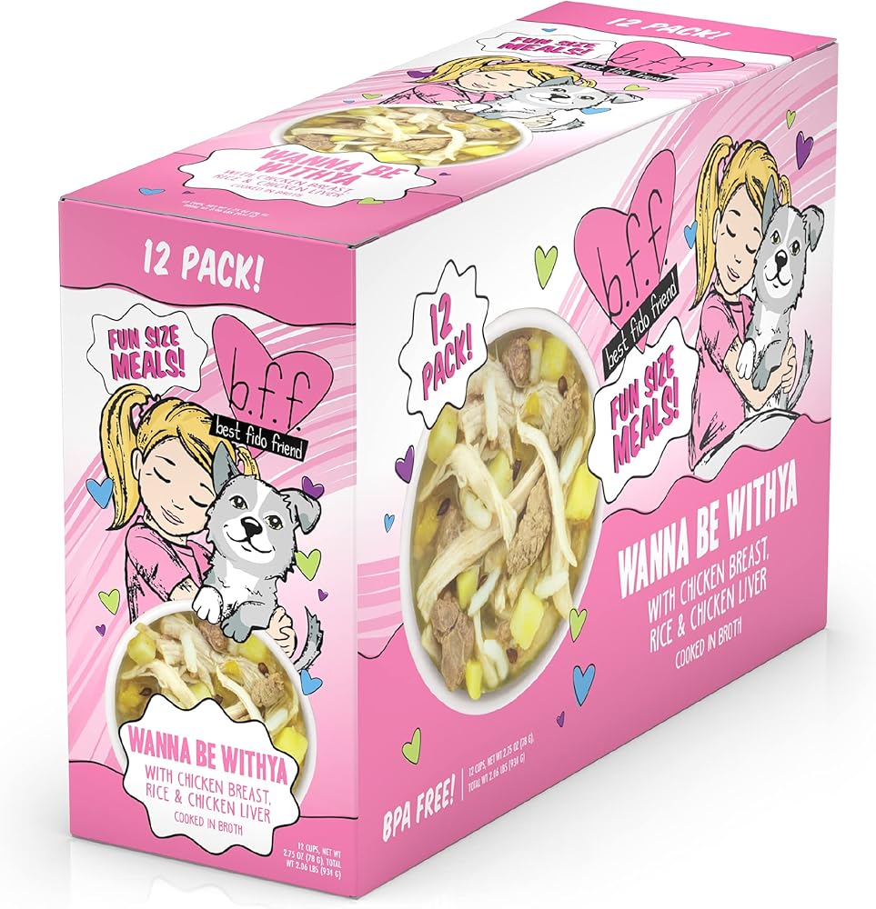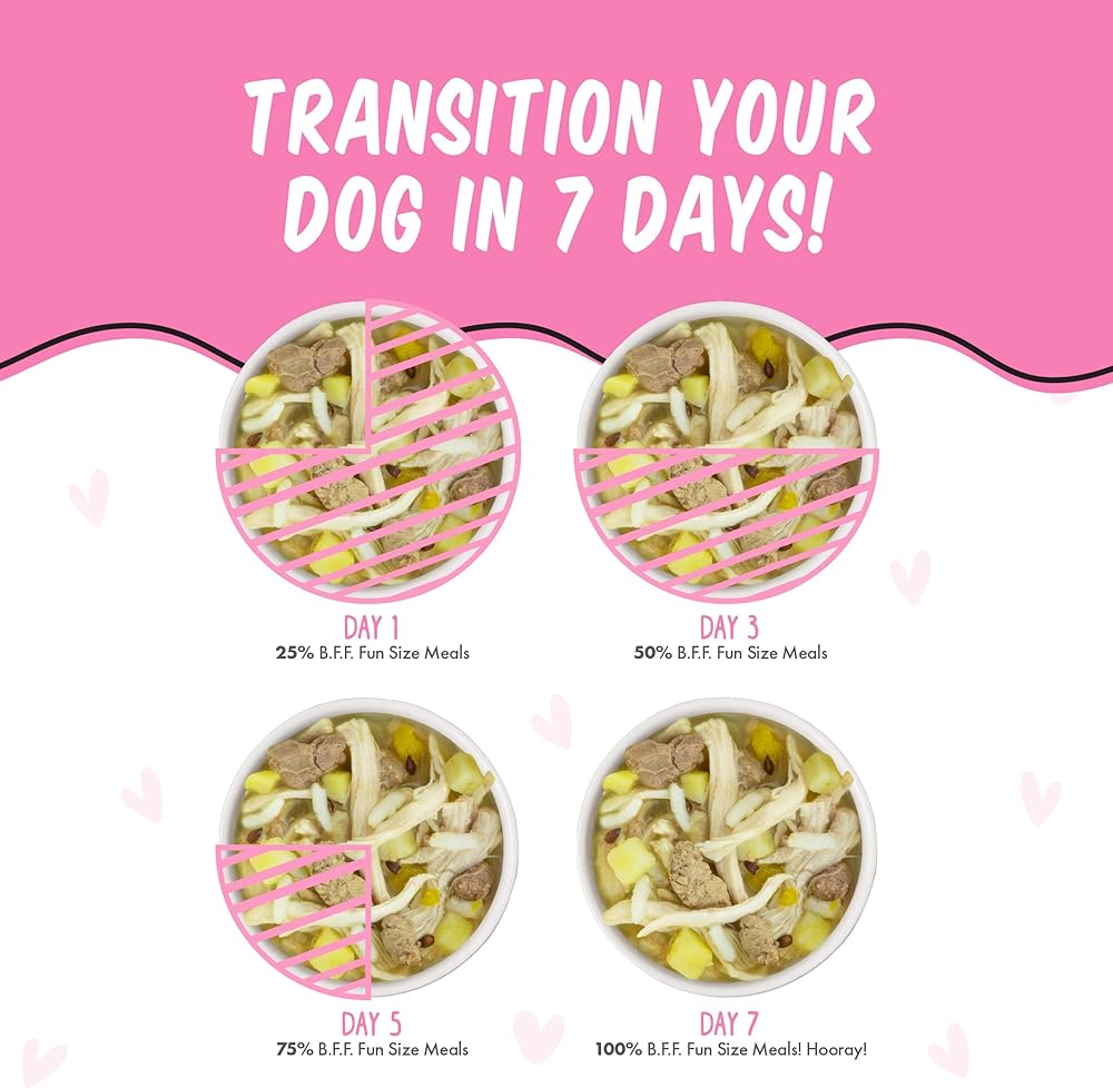 - B.F.F. Fun Size Meals, We Be Jammin' with shredded chicken, salmon, sweet potato, peas & rice cooked in broth for extra yum! 2.75oz Cups (Pack of 12)
