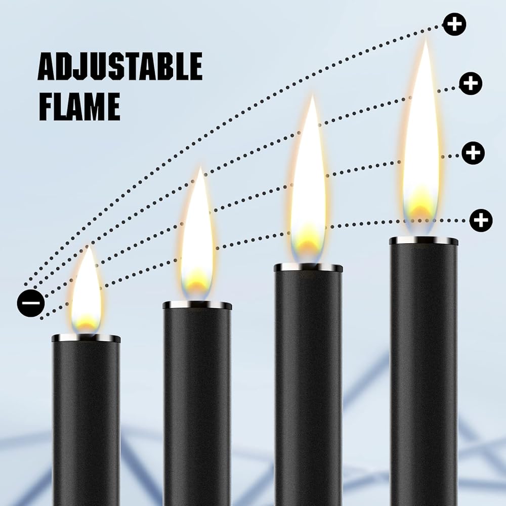 🔥【ADJUSTABLE FLAME & FUEL VISIBLE】: The refillable long lighter has 3 g gas capacity to ensure long lasting use. You can adjust flame size easily without any tools. In addition, Don't worry about when to refuel gas in the lighter. Shake the lighter to see residual fuel from the visible window. You can check and fill it at any time. Note⚠️!!! Excessive filling will cause butane leakage. When first filling, please use a tool to press the bottom inflation port to release excess air.