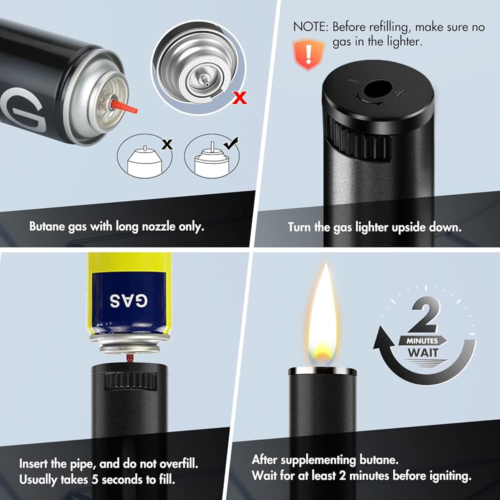 🔥【Note】: This lighter does not contain butane, you need to purchase a general-purpose butane fuel refill. When filling butane, make sure the flame outlet of the lighter is facing the ground, fill it for 3-5 seconds, and wait 15 seconds to cool down. Rotate the adjustment knob to control the flame size. will solve all your problems! (Lighter does not work, cool for 3-5 minutes, do not discard. Check that the fuel sight glass is full of fuel. Use it for a few days and you'll love it!)