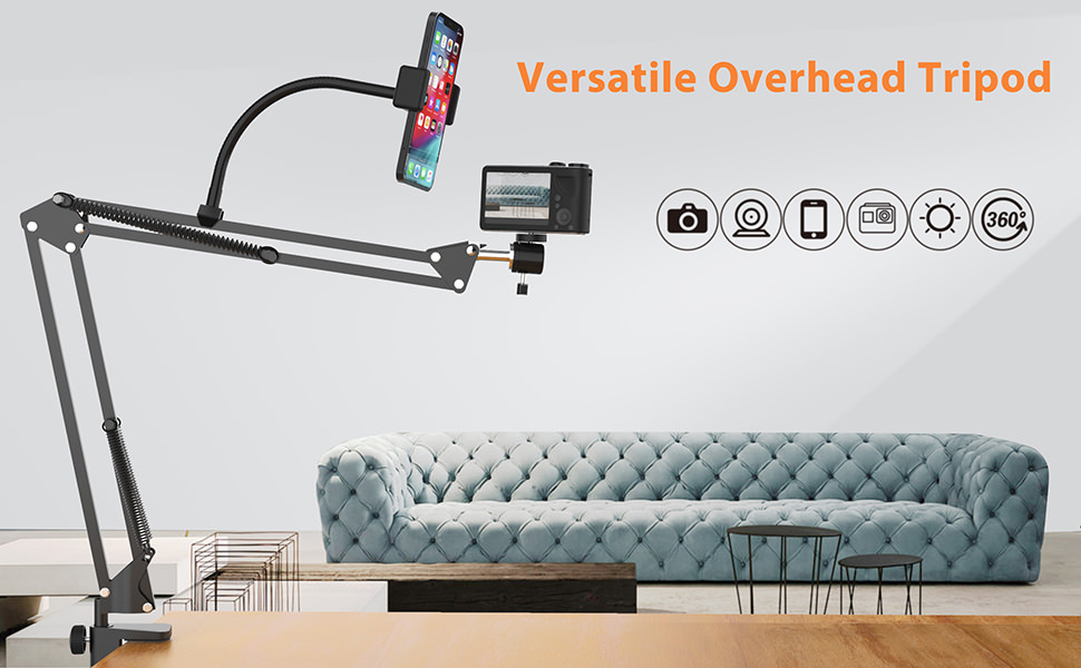 Overhead Tripod for iPhone Compact Camera: Flexible Scissor Arm Ring Light Desk Mount Live Streaming Kit, Phone arm Stand for Online Teaching Webcam Meeting Video Recording Baking Crafting Nail Art