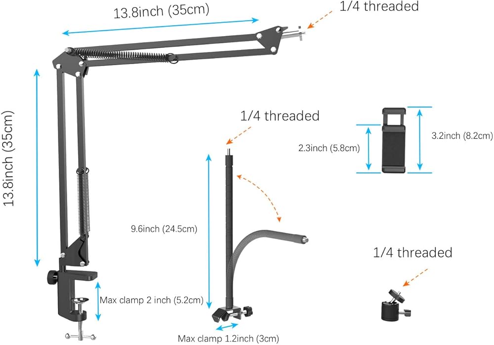 【Extra added Flexible Clip Arm】The scissor boom arm, ball head, C clamp, phone clip holder and extra flexible clamp arm which provide your multiple device(e.g Cell Phone, Lightweight Camera, Webcam, Ring Light, Mini projector) various combinations application scenarios. It's much useful for Online Teaching Meeting, Overhead Video Recording, Cooking, Baking, Crafting, Drawing, Nail Art, Tattoo etc. ✔***It has a max load weight of 3 lbs/1.4 kg(Not for heavy duty Cameras or devices).