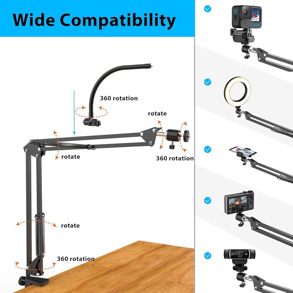 【Universal 1/4 Thread Screw Head】 This over head gooseneck tripods mount with a standard 1/4" thread head, compatible with lightweight camera like Digital Camera and desktop webcam like Logitech Brio 4K, C930e, C920, C920s, C922, C922x, C615, or 6"/8"/10" Ring light and Gopro lightweight action camera, Pico Projector.