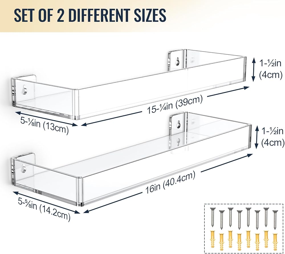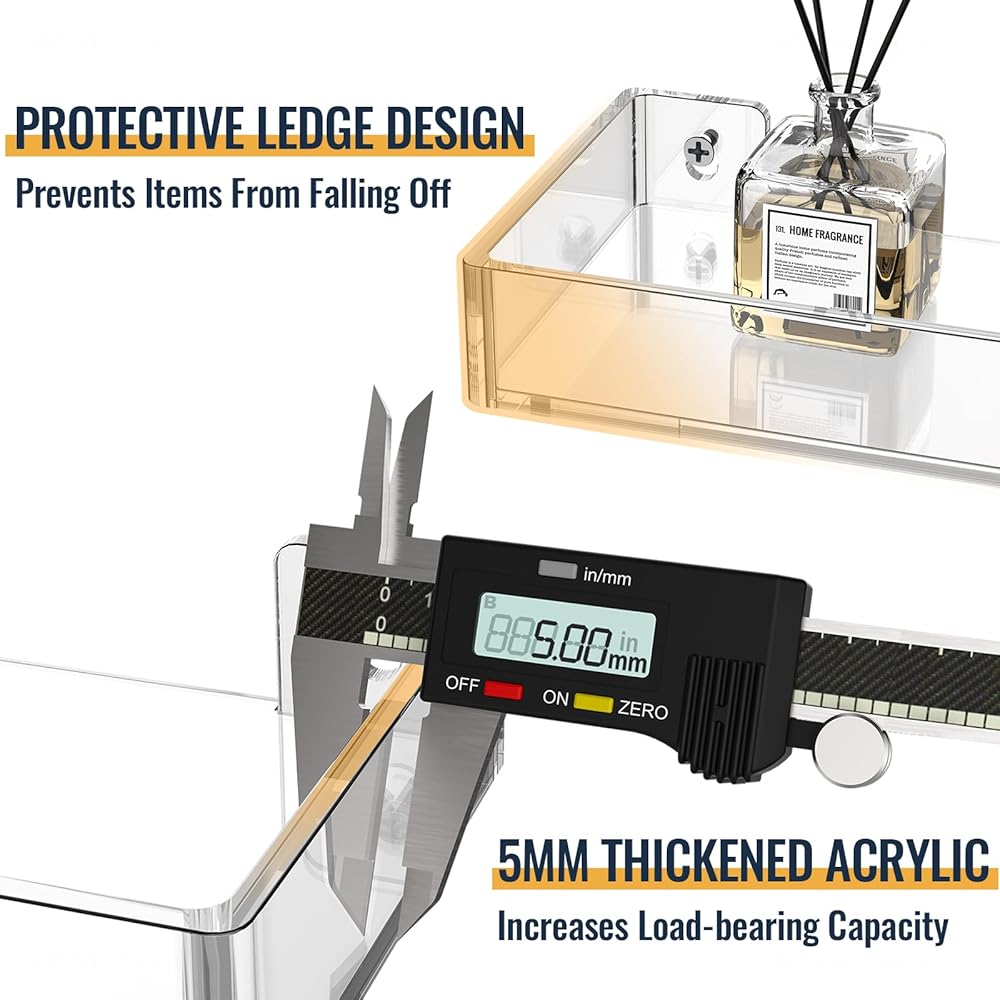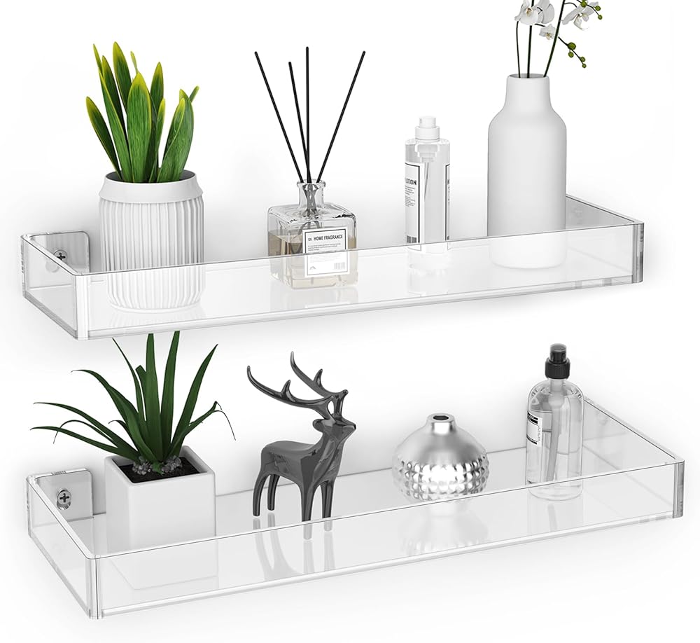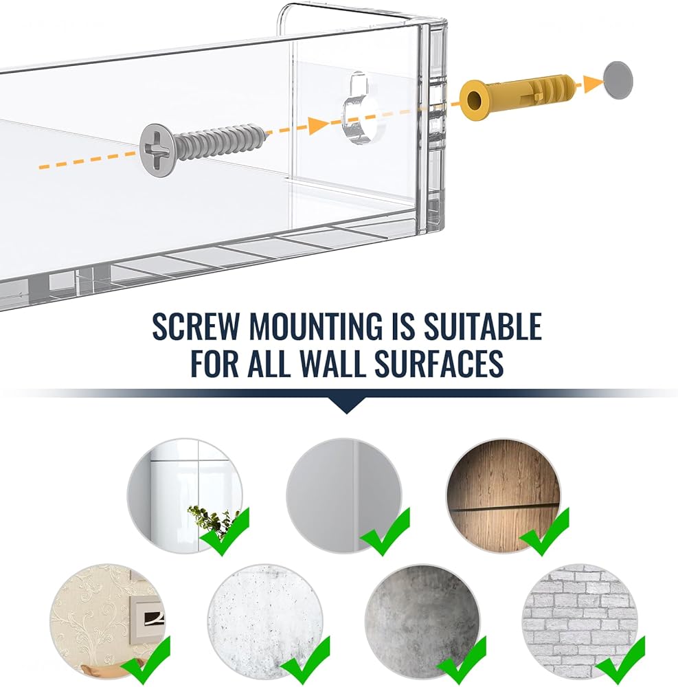 ✅【Premium Construction】These modern wall mount shelves are made of premium quality acrylic that is strong and weather-resistant to ensure its durability and security from breakage. The thickened board improves bearing capacity for heavy loading weights, and all edges and corners are rounded and finely polished without protruding screws. Smooth surface with no snagging or bumping and you can simply wipe off dust on the wall shelf organizer with a microfiber or gentle cloth to keep its luster.