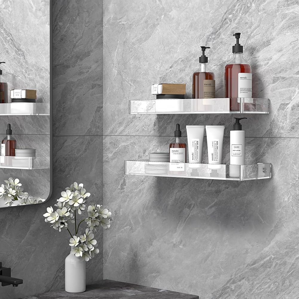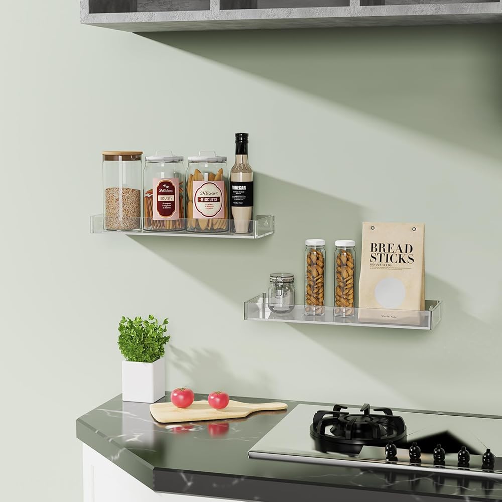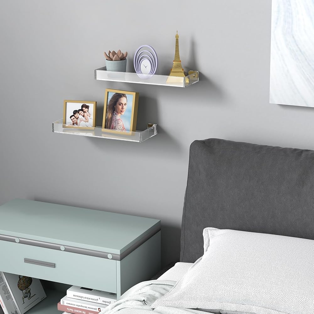 ✅【Premium Construction】These modern wall mount shelves are made of premium quality acrylic that is strong and weather-resistant to ensure its durability and security from breakage. The thickened board improves bearing capacity for heavy loading weights, and all edges and corners are rounded and finely polished without protruding screws. Smooth surface with no snagging or bumping and you can simply wipe off dust on the wall shelf organizer with a microfiber or gentle cloth to keep its luster.