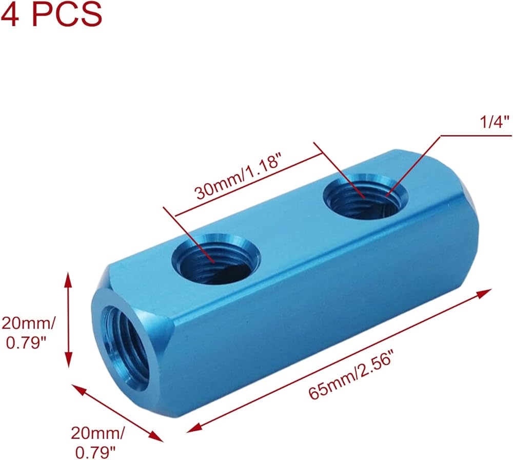Position: 2 way; Number of threaded ports: 5 ports; Threaded port diameter: 1/4" inch, Package: 4 x air hose manifold block