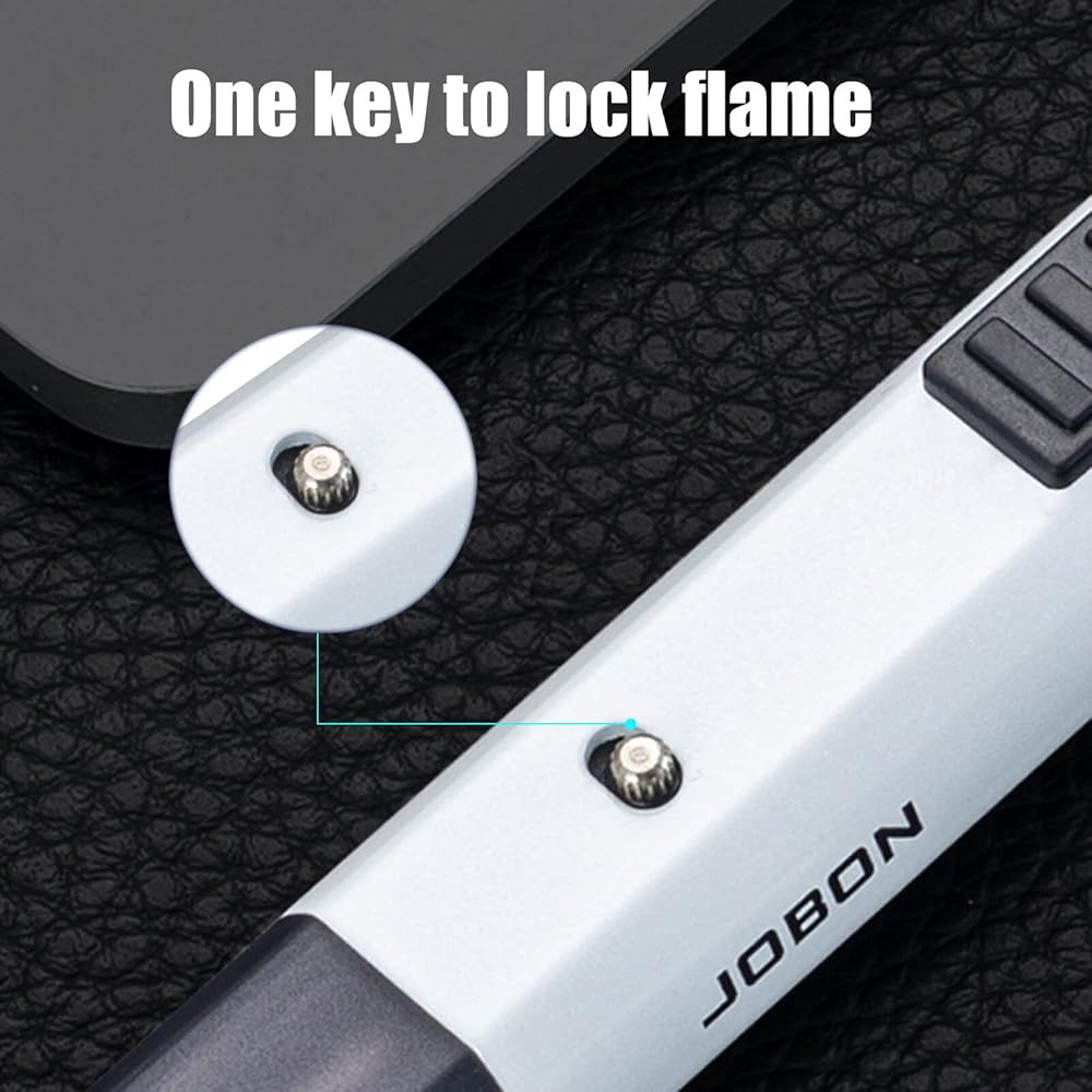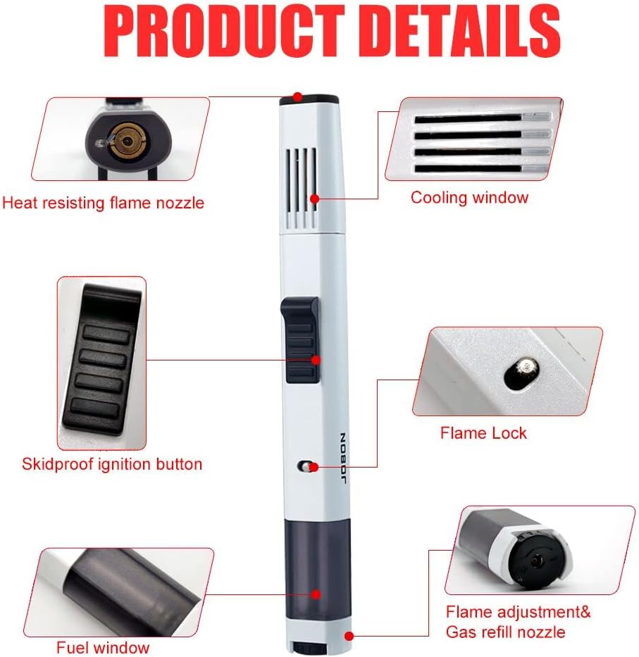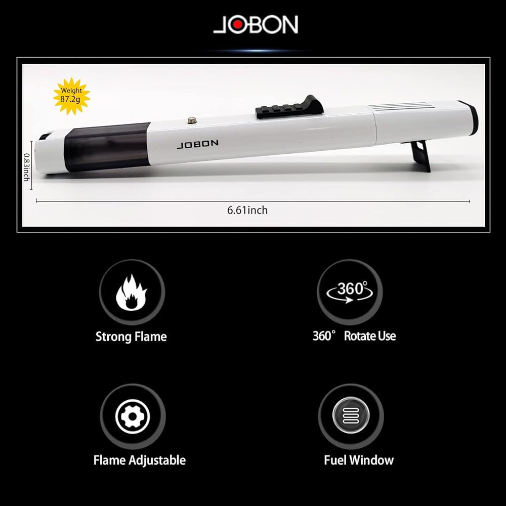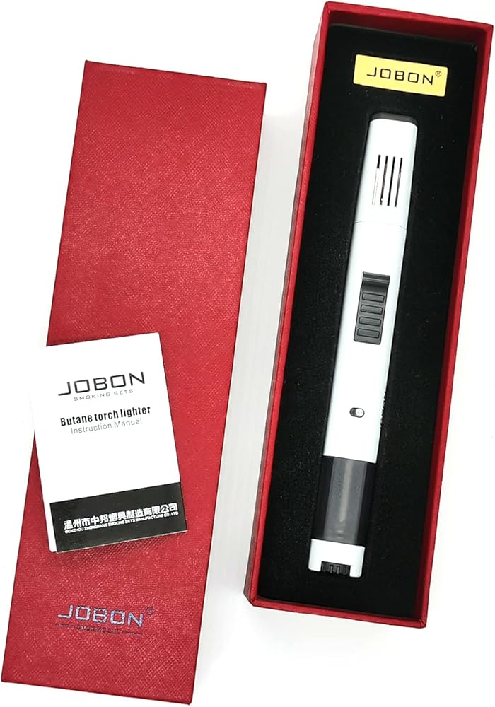 JOBON Torch Lighter,Long Jet Flame Refillable Butane Pen Lighter with Fire Lock Visible Gas Window Bracket for Candle Grill Cooking Camping (Butane Not Included) (White)
