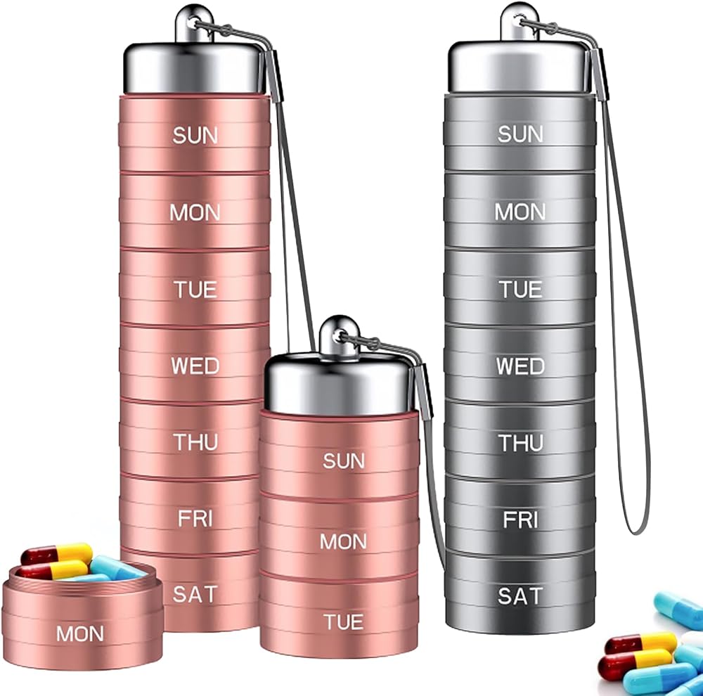 منظم حبوب دواء اسبوعي معدني، منظم حبوب دواء مقاوم للماء مصنوع من خليط معدني من الالومنيوم للسفر، منظم محمول للفيتامينات لمدة 7 ايام، حاوية حبوب لحفظ الفيتامينات وزيت السمك (ذهبي وردي، فضي)