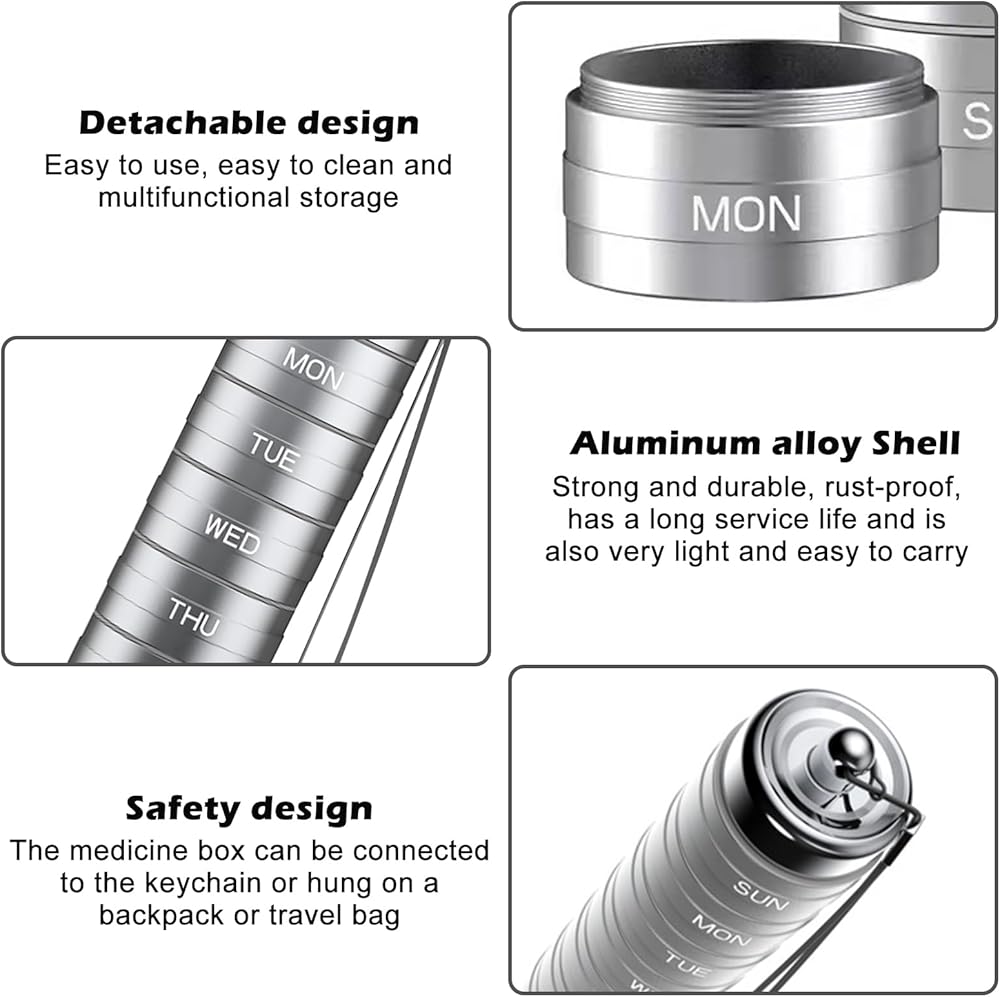 ▶ منظم الفيتامينات مصنوع بشكل أساسي من خليط معدني من الألومنيوم عالي الجودة. منظم حبوب الدواء الأسبوعي المعدني قوي بما فيه الكفاية وغير ضار وخفيف الوزن.